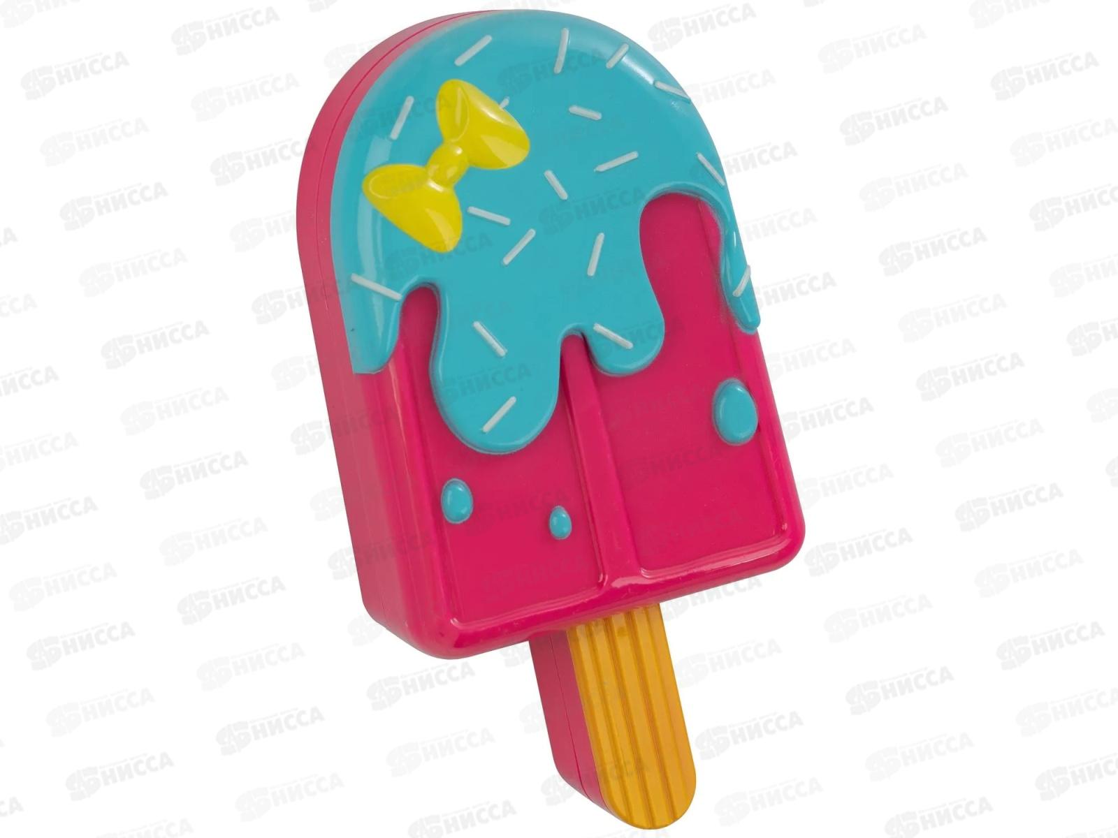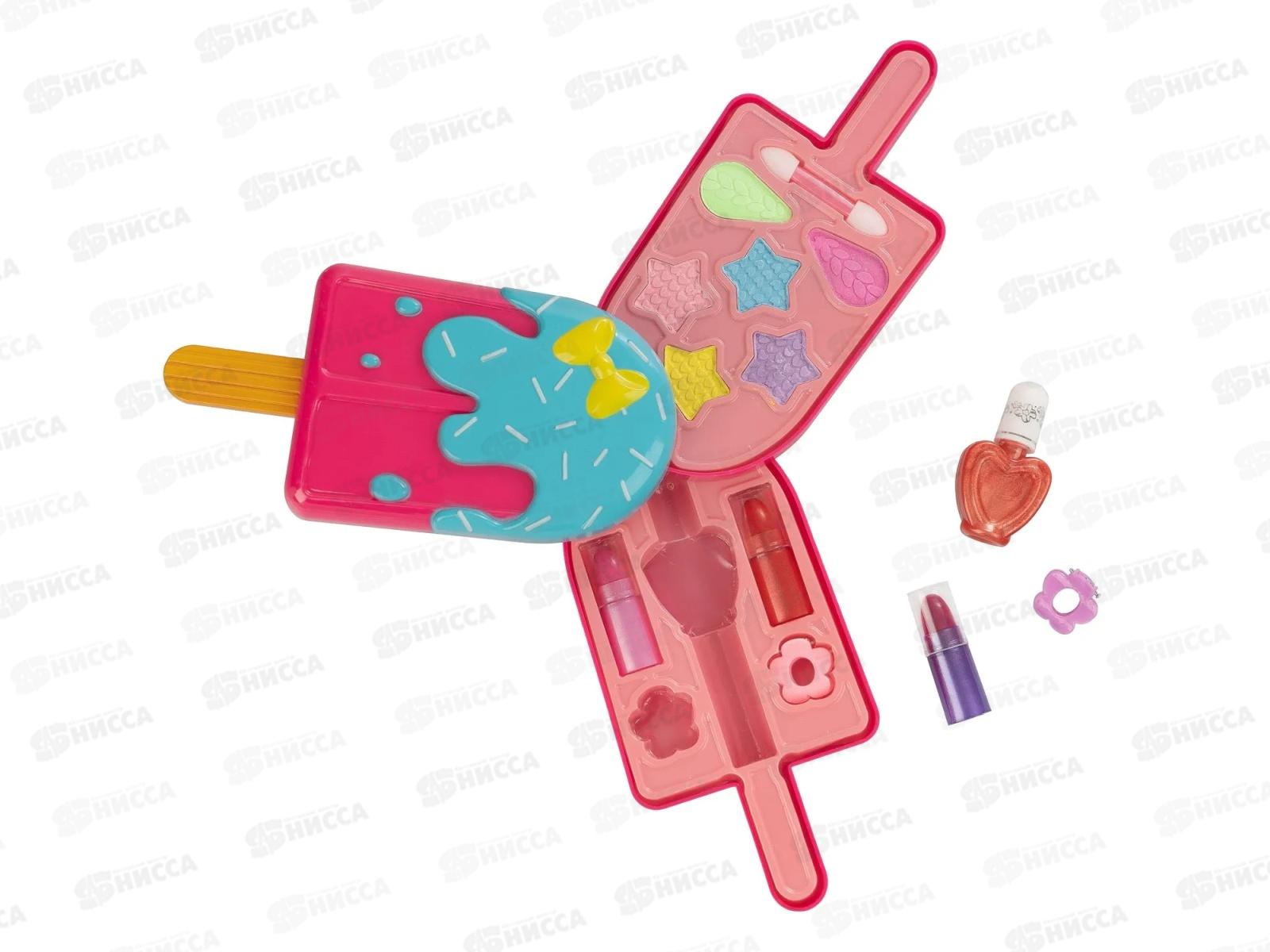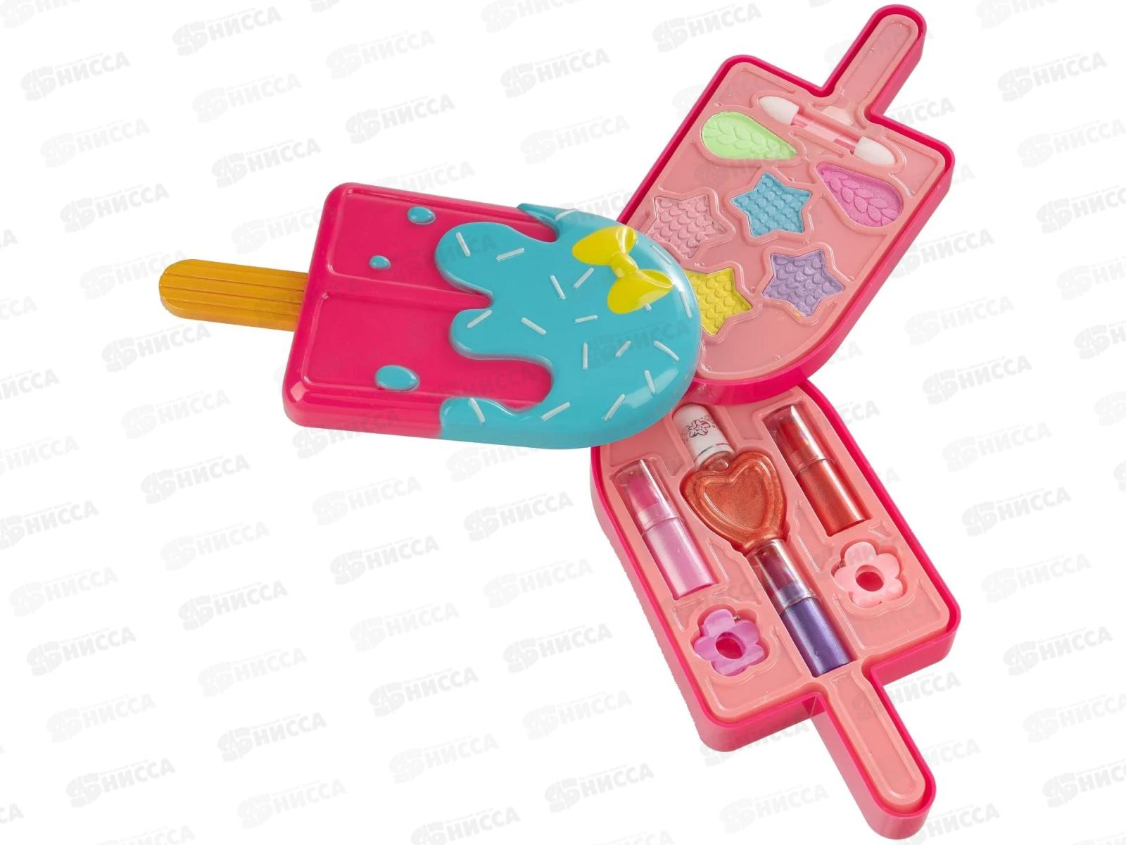 Вся косметика полностью безвредна для детской кожи и макияж легко смывается. В наборе: косметичка-мороженое эскимо тени для век 6 оттенков (4,6 г), помада 3 оттенка (3,9 г), лак для ногтей (5,9 г), аппликатор 1шт, заколки 2 шт.