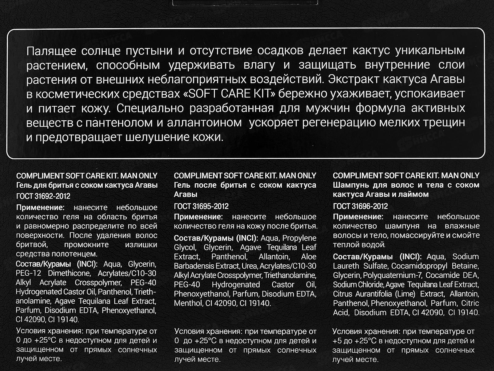 Состав шампуня: вода, лауретсульфат натрия, кокамидопропилбетаин, глицерин, поликватерниум-7, кокамид ДЭА, хлорид натрия, экстракт листьев Агавы Текиланской, экстракт Лайма (Citrus Aurantifolia), аллантоин, пантенол, феноксиэтанол, парфюм, лимонная кислота, динатриевая ЭДТА, CI 42090, CI 19140. Состав геля для бритья: вода, лауретсульфат натрия, кокамидопропилбетаин, глицерин, лаурилглюкозид, кокамид ДЭА, хлорид натрия, экстракт листьев Агавы Текиланской, аллантоин, пантенол, феноксиэтанол, парфюм, лимонная кислота, динатриевая ЭДТА, CI 42090, CI 19140. Состав геля после бритья: вода, пропиленгликоль, глицерин, экстракт листьев агавы текиланы, пантенол, аллантоин, экстракт алоэ барбадосского, мочевина, акрилаты/C10-30 алкилакрилат кроссполимер, триэтаноламин, ПЭГ-40 гидрогенизированное касторовое масло, феноксиэтанол, отдушка, динатриевая ЭДТА, ментол, CI 42090, CI 19140.
