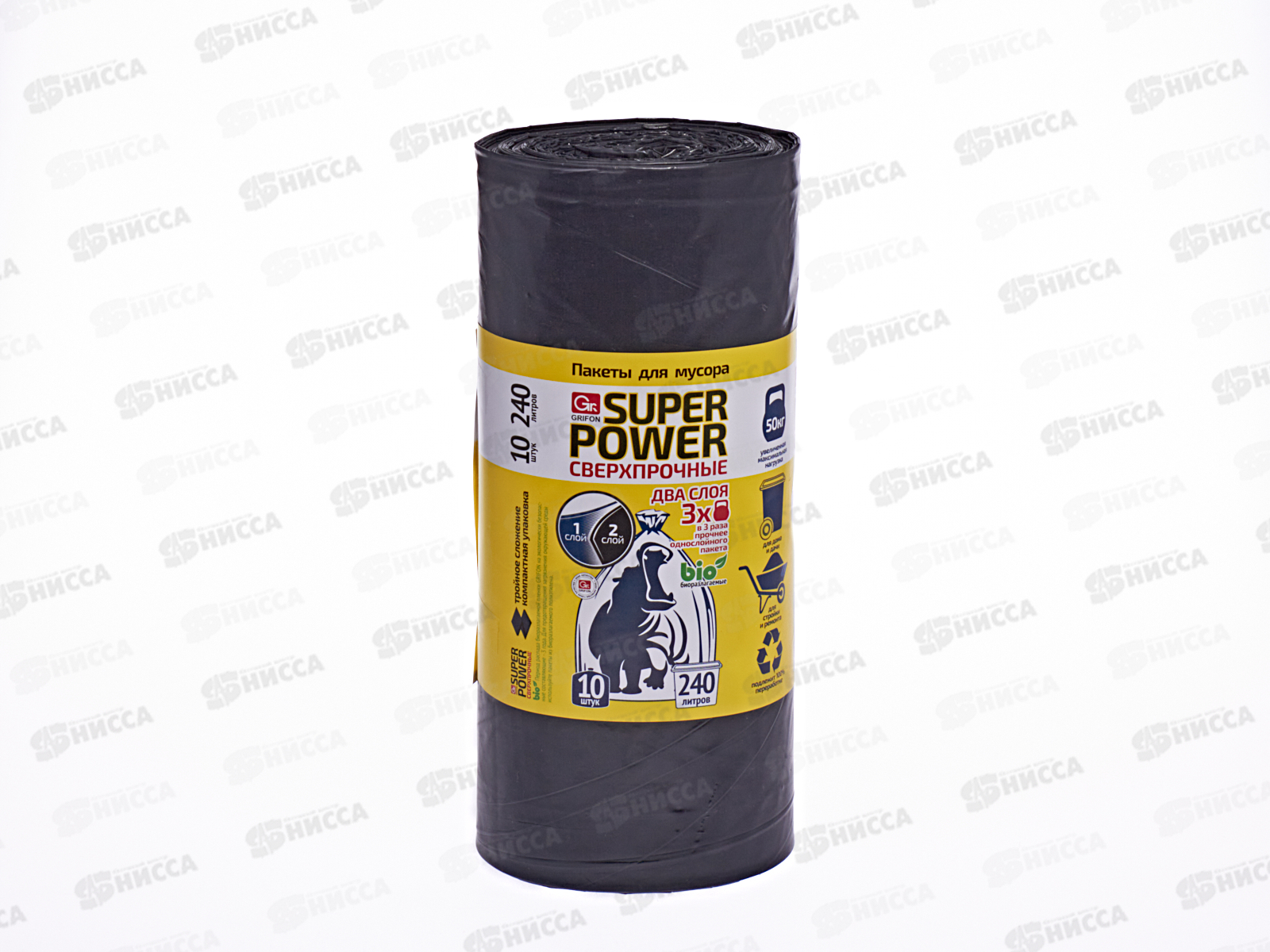 Пакеты для мусора GRIFON двухслойные особо прочные 240л 10шт рулон 101-094 *15