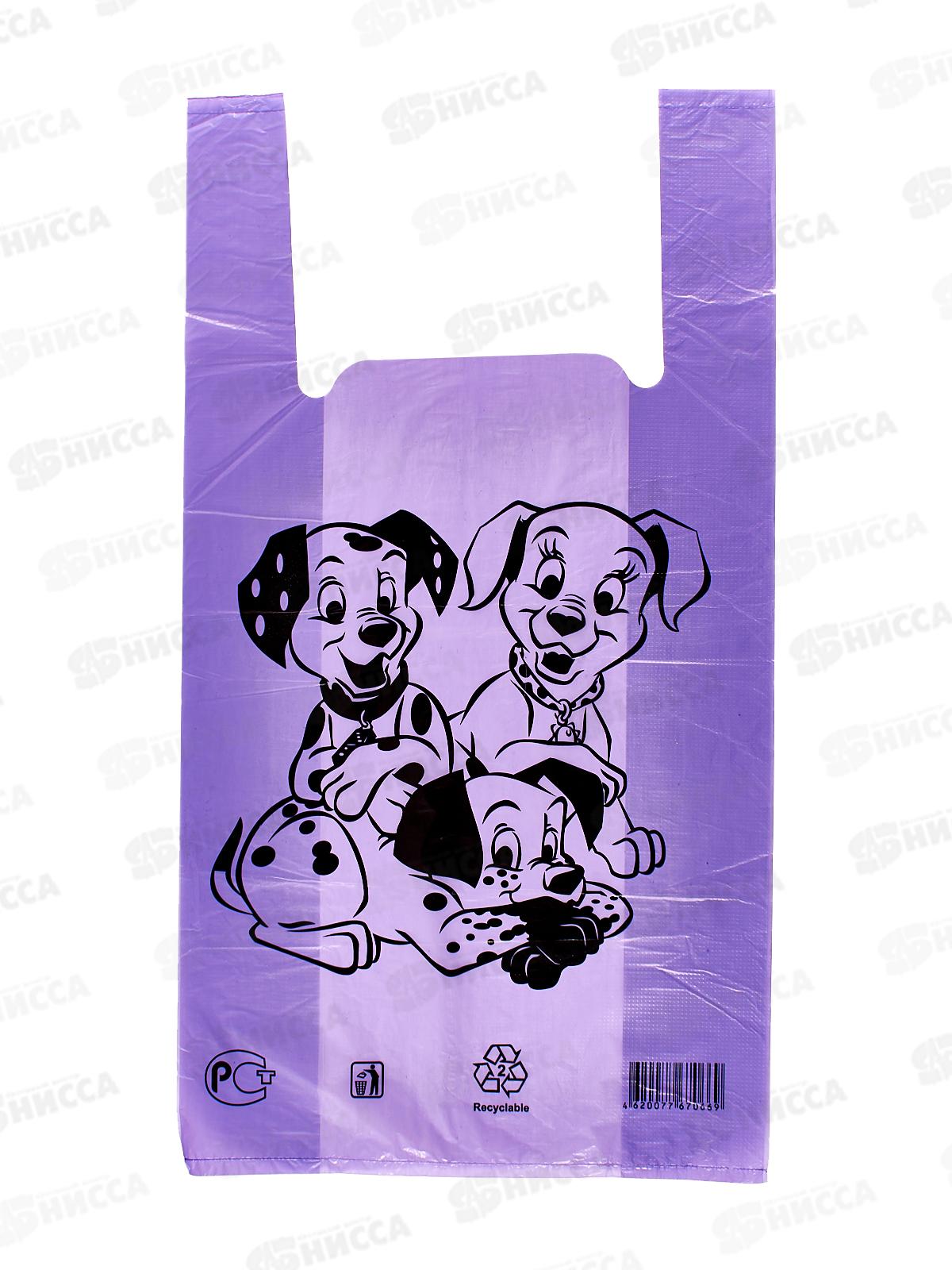Пакет - майка сиреневый с дизайном "Далматины", 30х55 см. Самым популярным видом Пакетов среди покупателей являются Пакеты-майки. Они очень вместительны благодаря своей конструкции и наличию боковых складок, поэтому они используются для хранения и транспортировки любых товаров, в том числе и продуктов питания. Имеют удобные ручки, устойчивы к растяжению.