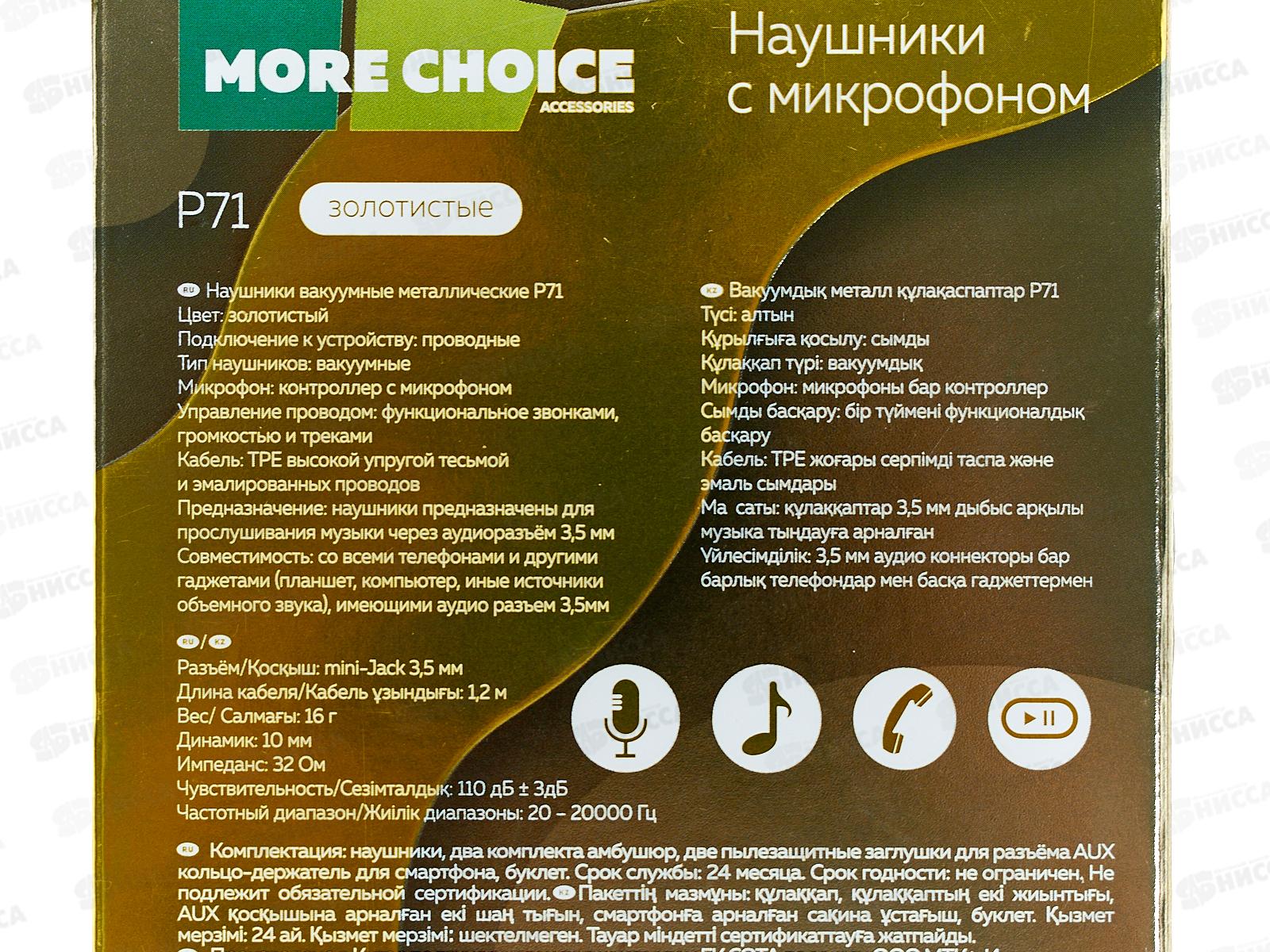 Наушники вакуумные AUX разъём с МК 1.2м, More Choice P71Gold