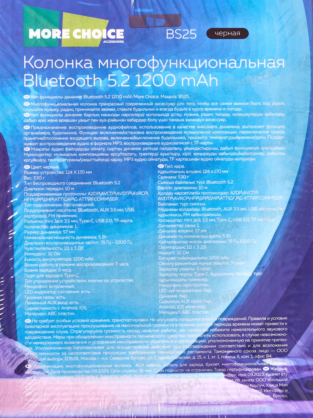 Колонка-Bluetooth 5.2 1200mAh многофункц. More Choice BS25 черный