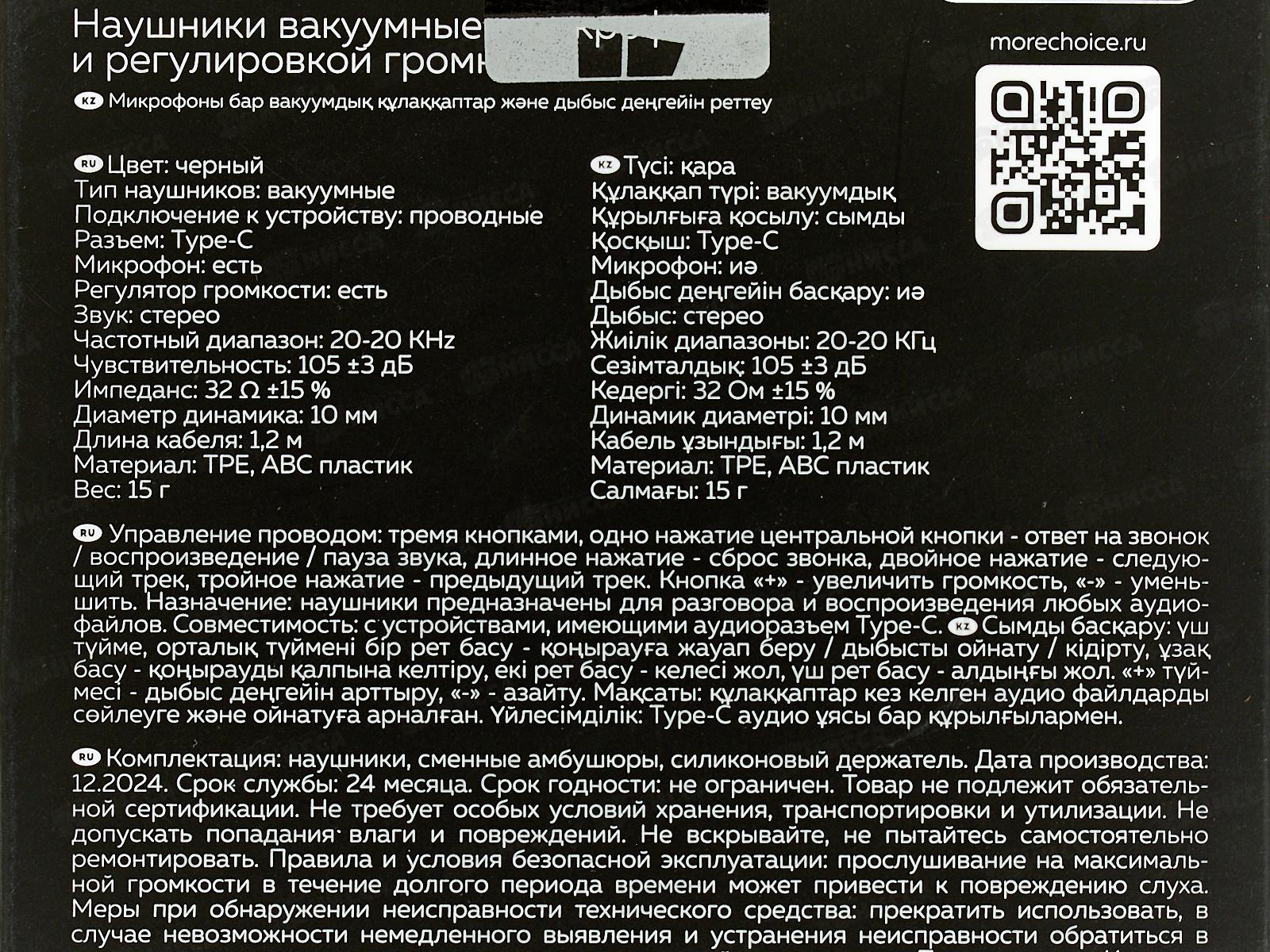 Наушники вакуумные Туре-С разъем с МК р/г 1,2м More choice G29a Black