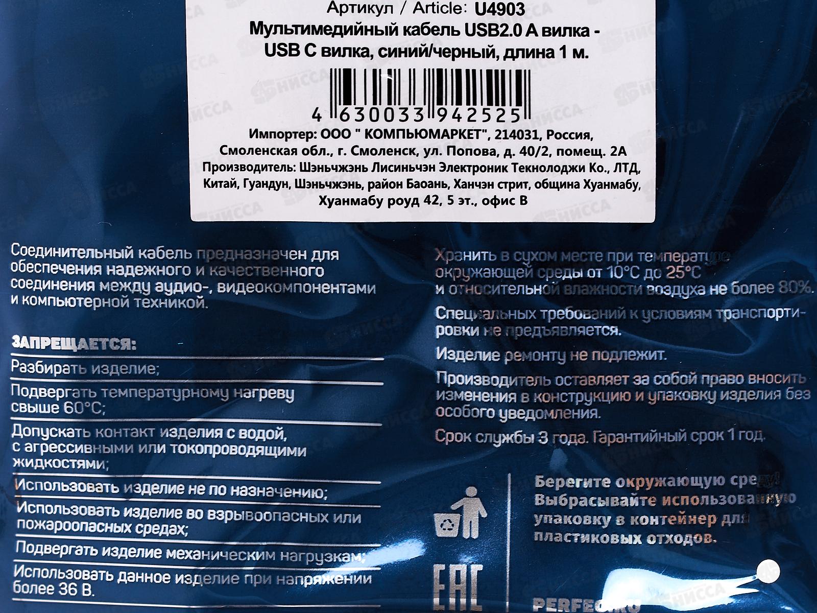 Кабель PERFEO USB2.0 A вилка - USB Type-C вилка, черно-синий, 1м, U4903 *100