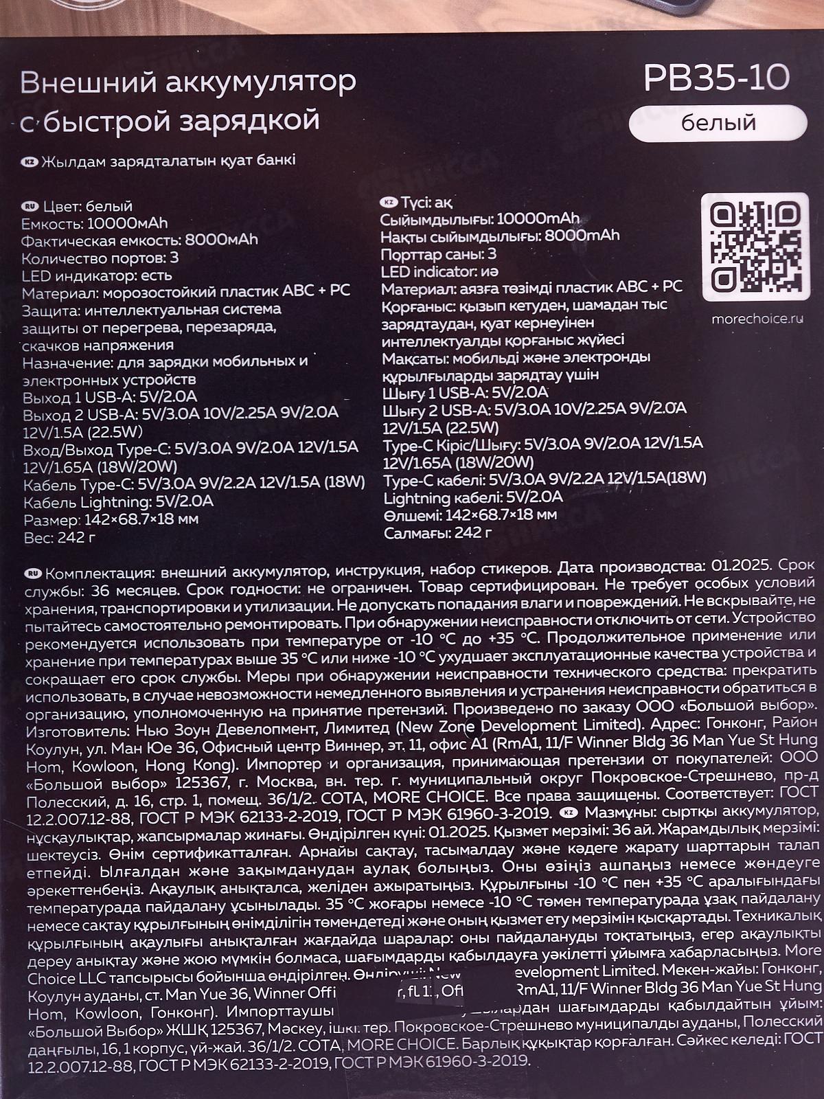 Повербанк поддерживает быструю зарядку, позволяя быстро восстанавливать заряд гаджетов. Выходные разъемы Type-C и USB обеспечивают легкое подключение смартфонов, планшетов и других устройств. Изготовленный из прочного ABS пластика, он легкий и долговечный, что делает его отличным спутником в путешествиях. Встроенные кабели Lightning и USB Type-C избавляют от необходимости искать дополнительные провода, так как все необходимое всегда под рукой. Комплектация: внешний аккумулятор, инструкция, набор стикеров.
