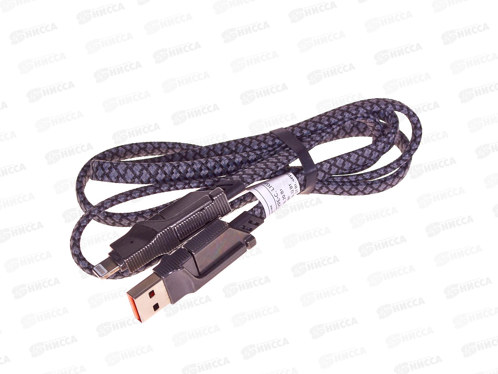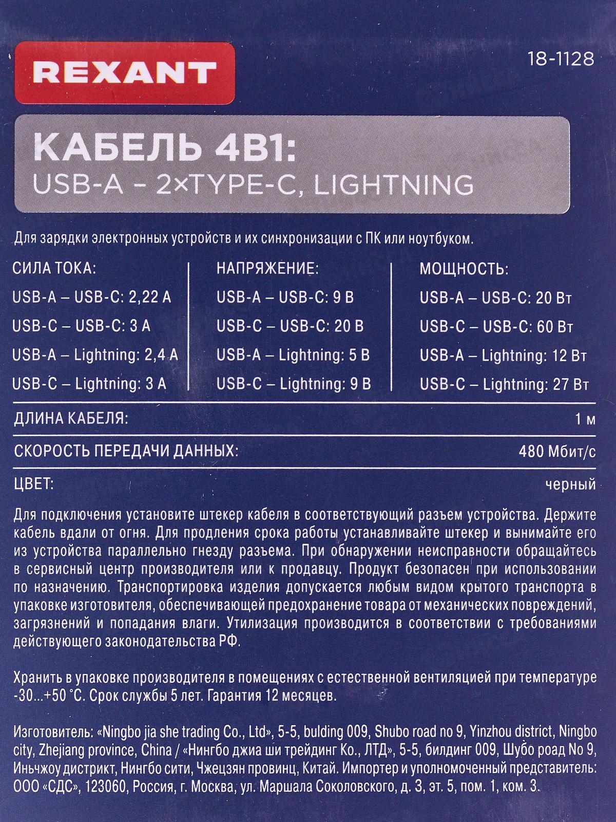 Кабель 4в1 USB-А Type-C, Lightning Type-C, 60Вт, 1м, в черной оплетке REXANT, 18-1128
