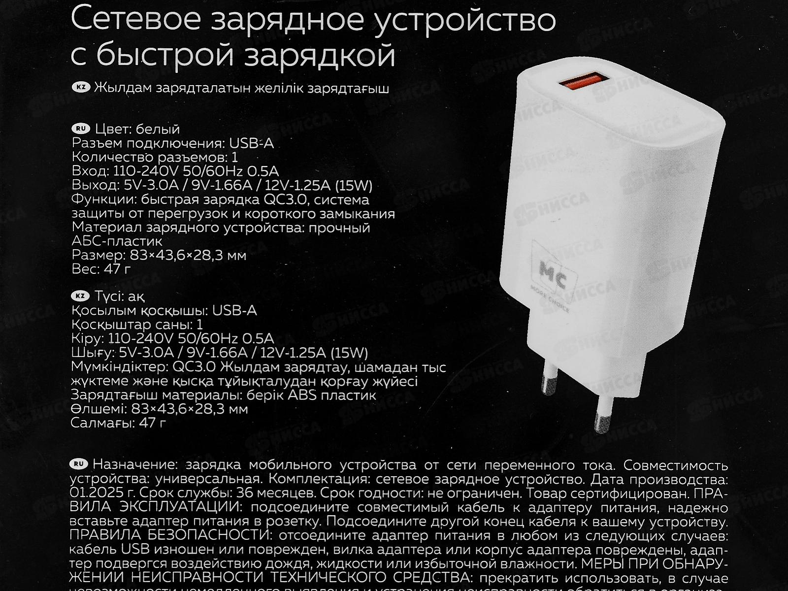 З/у сетевое 1USB 3.0A 15W QC3.0 More choice NC09 белый