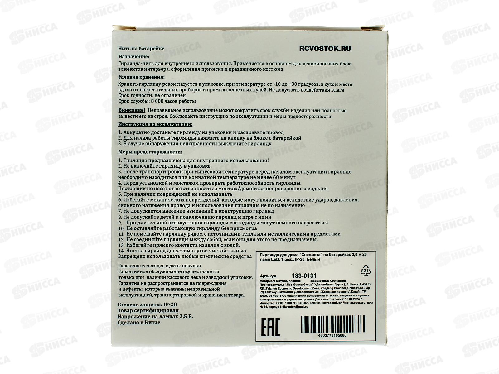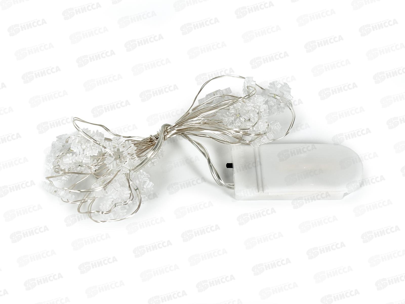 Гирлянда 2м "Снежинка" 20 LED 1 режим белый, тип питания от батареек 183-0131