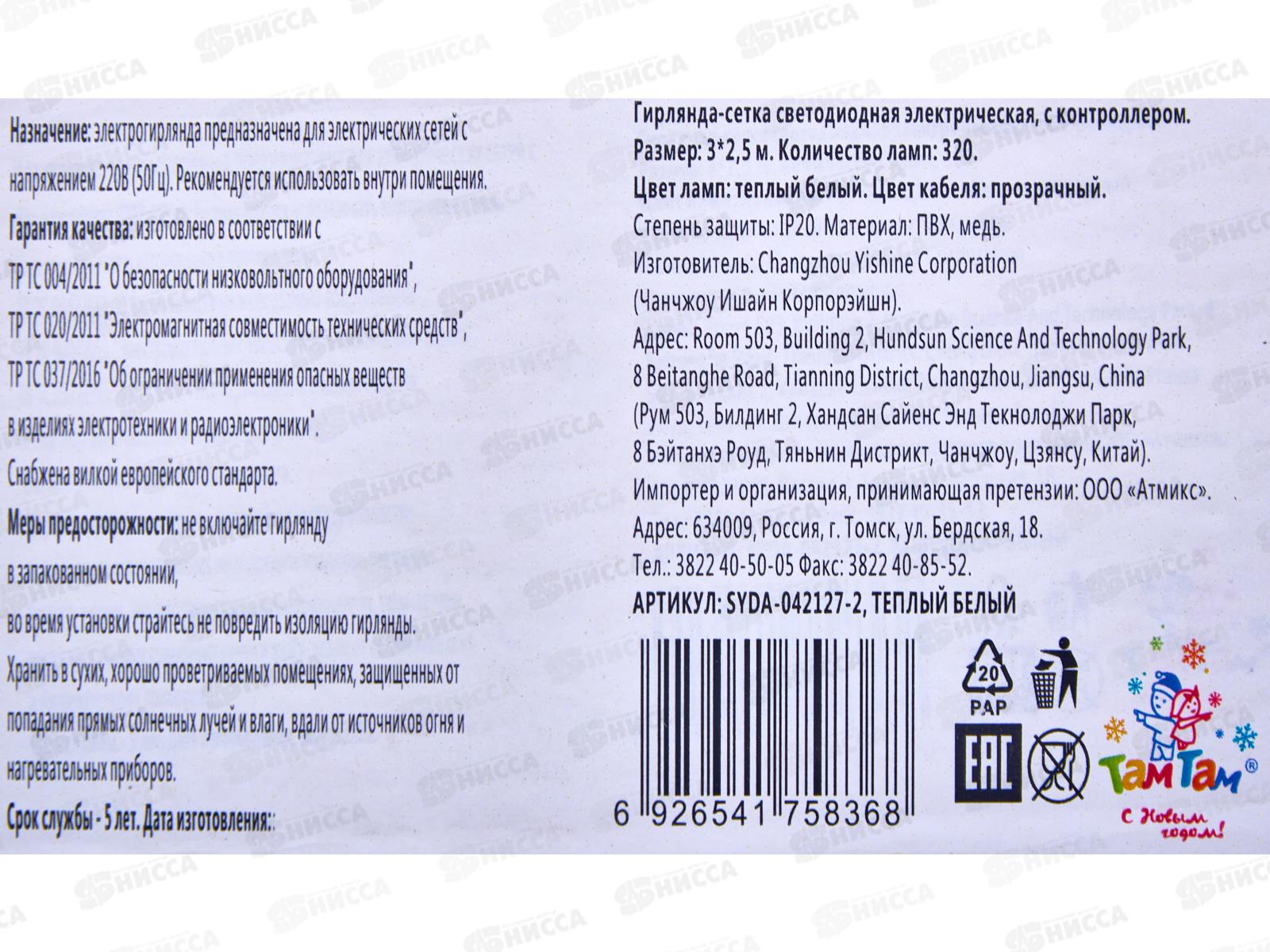 Гирлянда-сетка светодиодная, 3 х 2,5м, 320л, теп. белый SYDA-042127-2