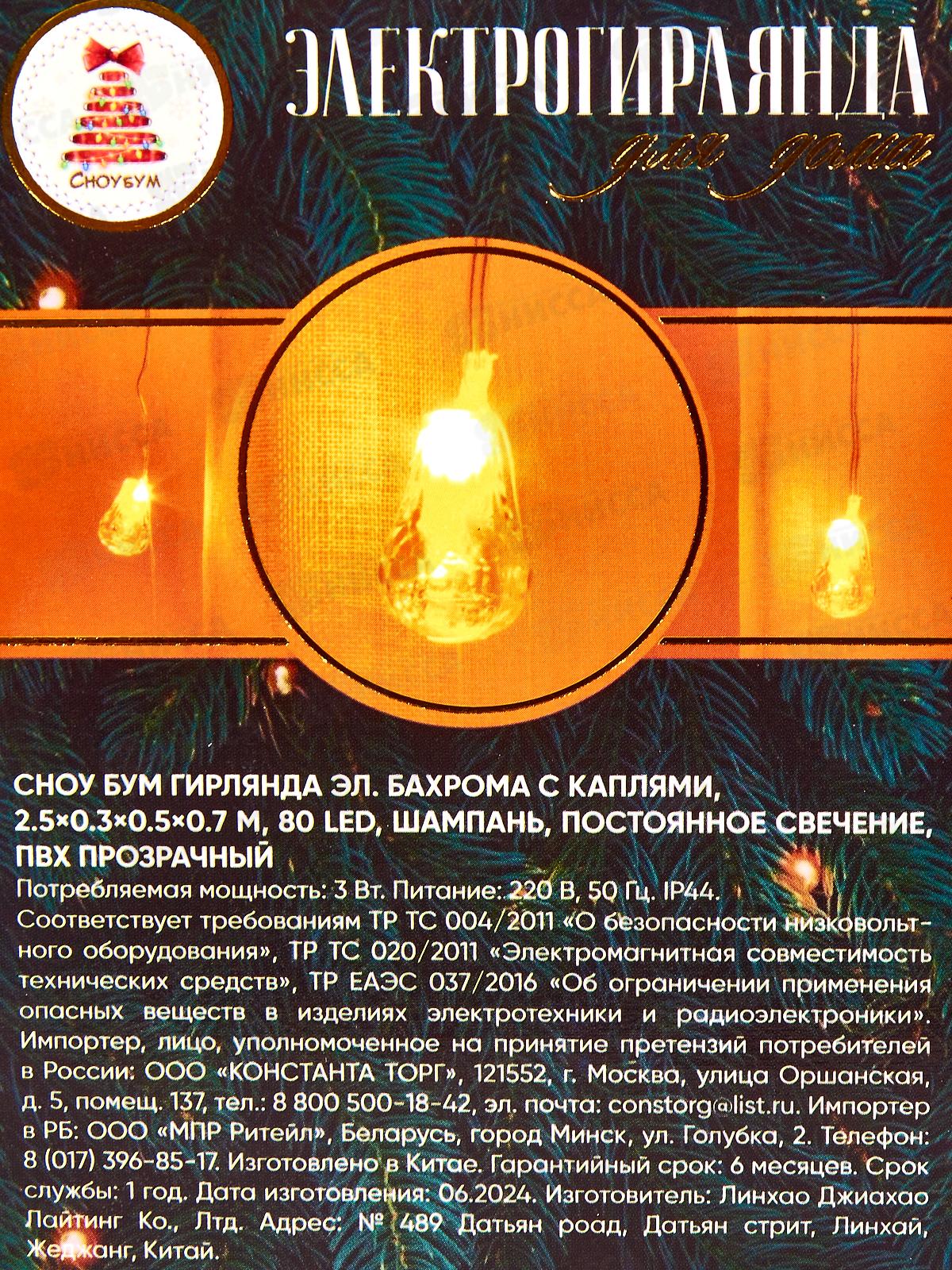 Гирлянда 2,5*0,5*0,5*0,7м бахрома с каплями 80LED шампань, 382-094 г