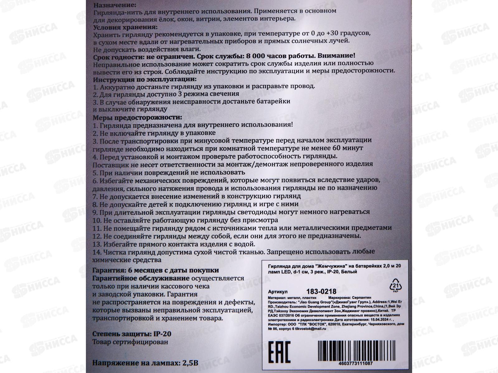 Гирлянда 2м Жемчужина 20LED 3режима белый 183-0218