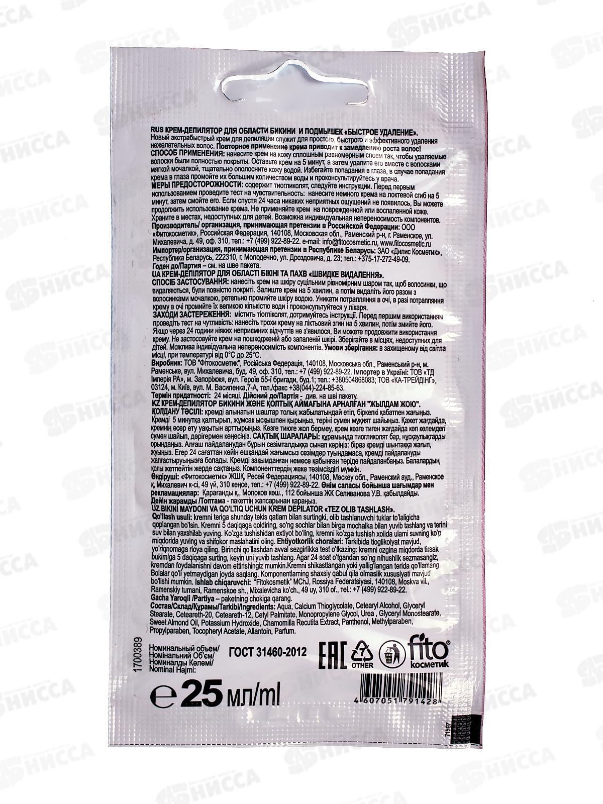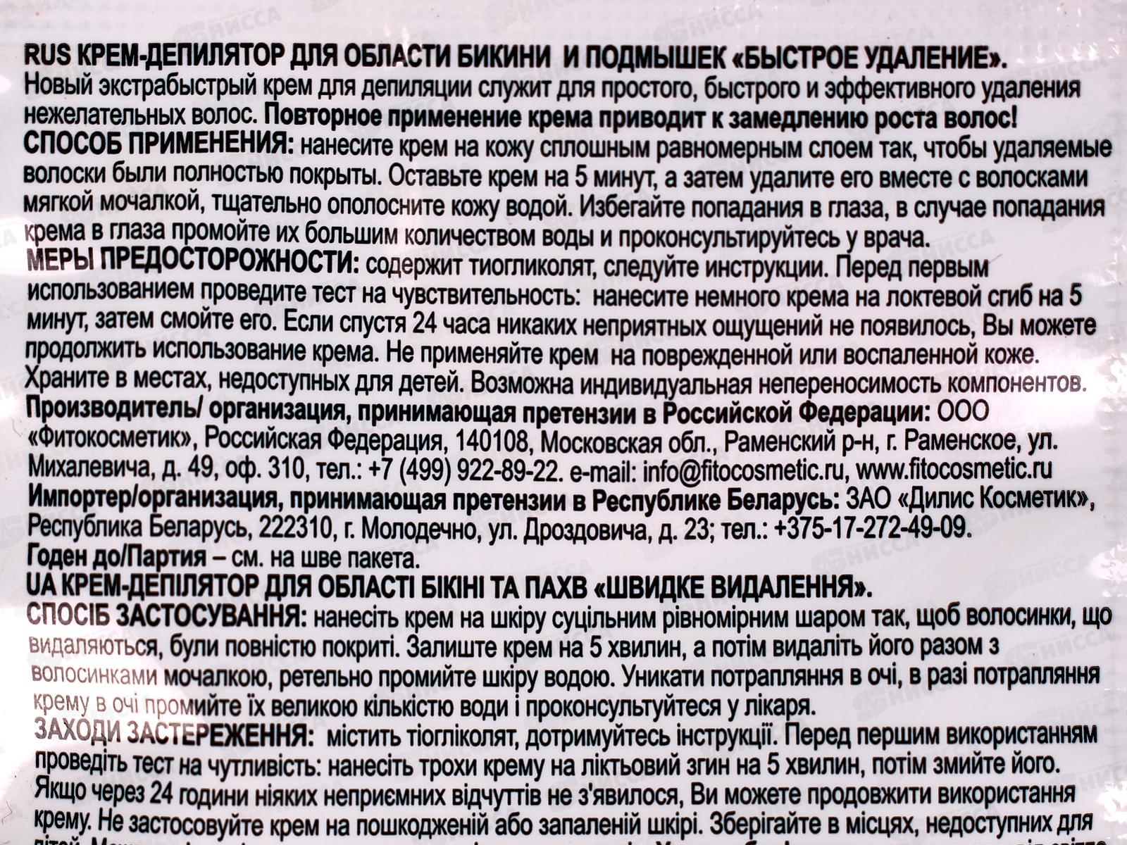 Крем-депилятор с экстрактом ромашки для области бикини и подмышек. Быстрое удаление - принципиально новое средство, благодаря наличию натуральных ингредиентов, позволяет мягко и суперэффективно убрать нежелательные волосы даже с самых чувствительных участков тела. Нанесите крем на кожу сплошным равномерным слоем так, чтобы все волоски были полностью покрыты. Оставьте крем на 3-5 мин, затем удалите его вместе с волосками лопаточкой, тщательно ополосните кожу водой. При необходимости, увеличьте время воздействия крема. Общее время воздействия не должно превышать 15 минут.