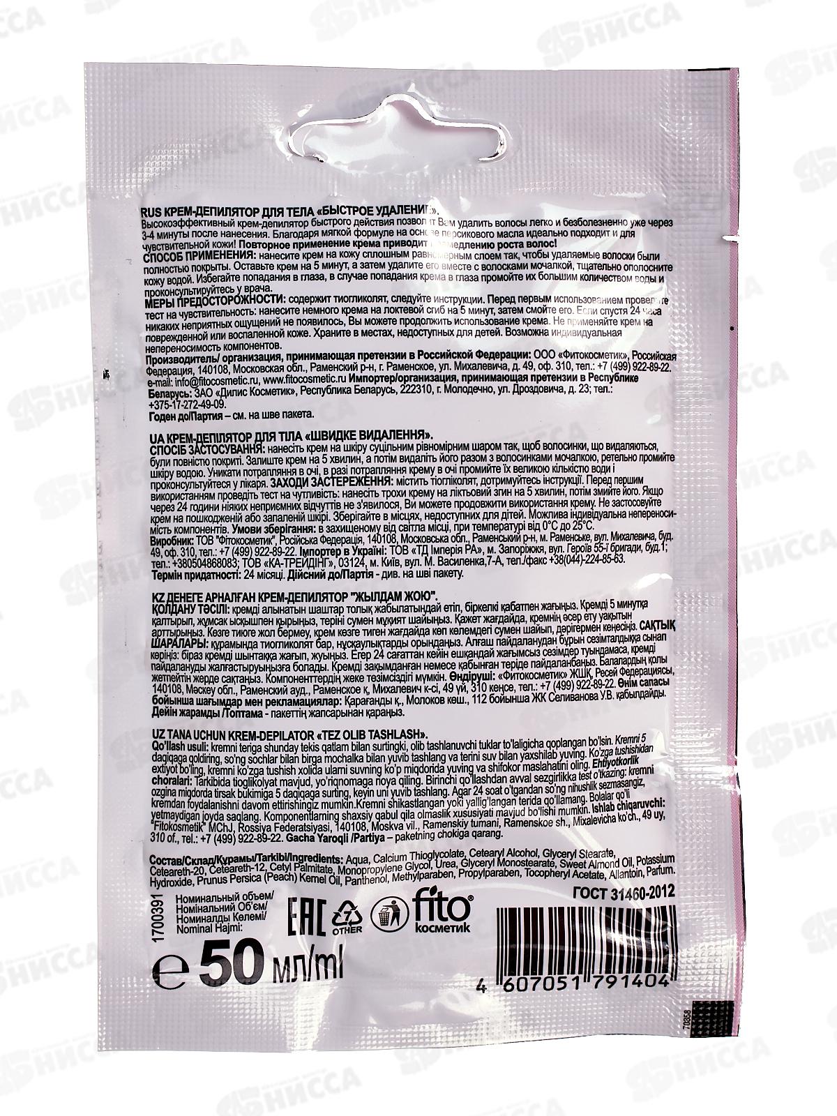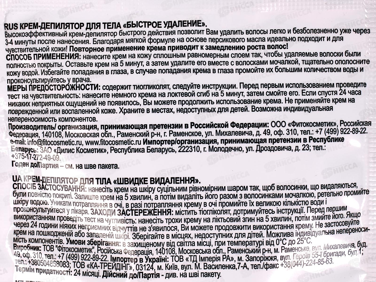 Крем-депилятор с персиковым маслом для области бикини и подмышек Быстрое удаление - принципиально новое средство, благодаря наличию натуральных ингредиентов, позволяет мягко и суперэффективно убрать нежелательные волосы даже с самых чувствительных участков тела. Нанесите крем на кожу сплошным равномерным слоем так, чтобы все волоски были полностью покрыты. Оставьте крем на 3-5 мин, затем удалите его вместе с волосками лопаточкой, тщательно ополосните кожу водой. При необходимости, увеличьте время воздействия крема. Общее время воздействия не должно превышать 15 минут.