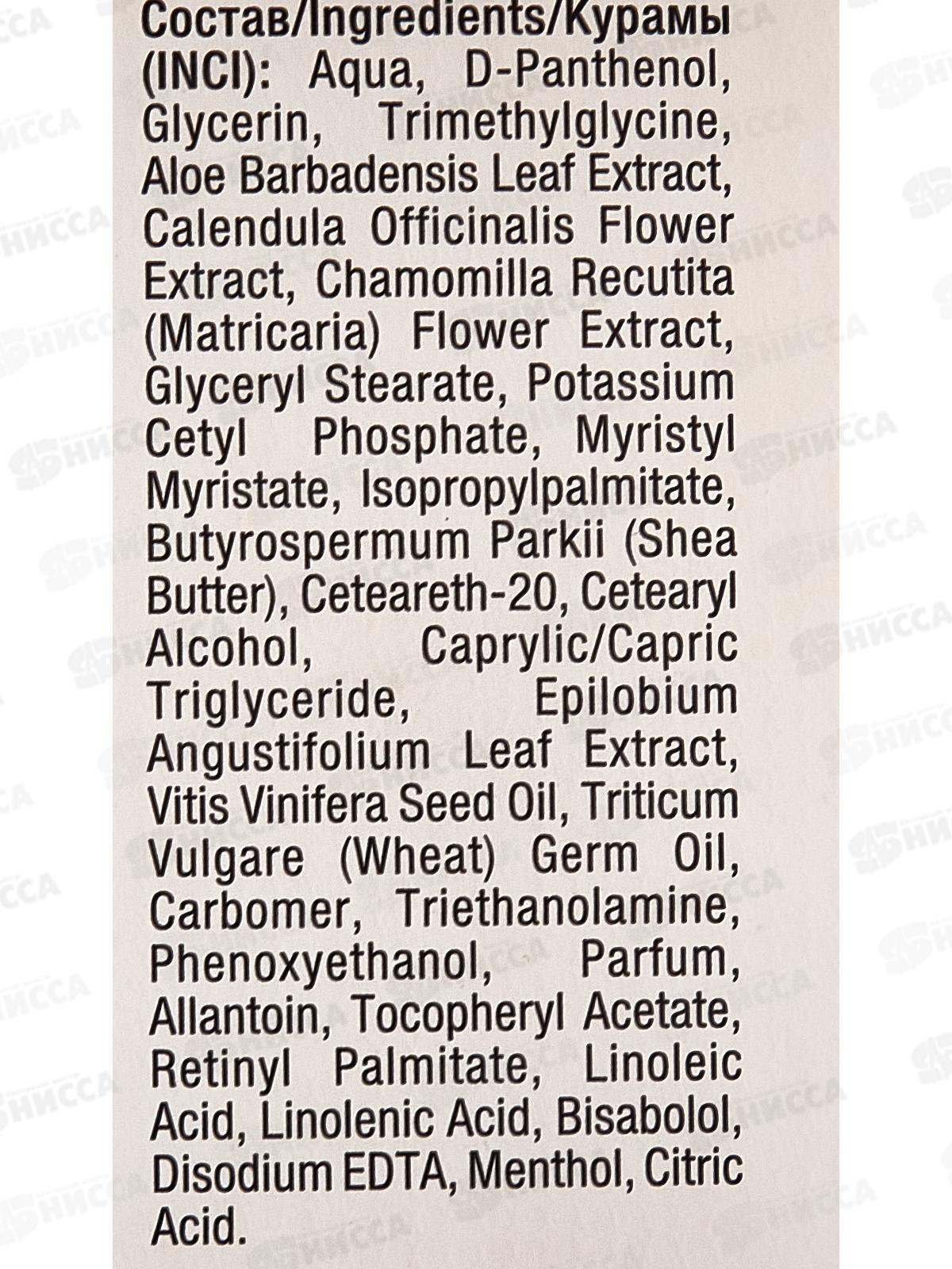 Состав: вода, D-пантенол, глицерин, триметилглицин, экстракт листьев алоэ вера, экстракт цветков календулы лекарственной, экстракт цветков ромашки аптечной (Chamomilla Recutita), стеарат глицерина, цетилфосфат калия, миристилмиристат, изопропилпальмитат, масло ши (Butyrospermum Parkii), цетеарет-20, цетеариловый спирт, каприловый/каприновый триглицерид, экстракт листьев кипрея узколистного (Epilobium Angustifolium), масло семян винограда культурного (Vitis Vinifera), масло зародышей пшеницы (Triticum Vulgare), карбомер, триэтаноламин, феноксиэтанол, отдушка, аллантоин, токоферола ацетат, ретинилпальмитат, линолевая кислота, линоленовая кислота, бисаболол, динатрий ЭДТА, ментол, лимонная кислота.