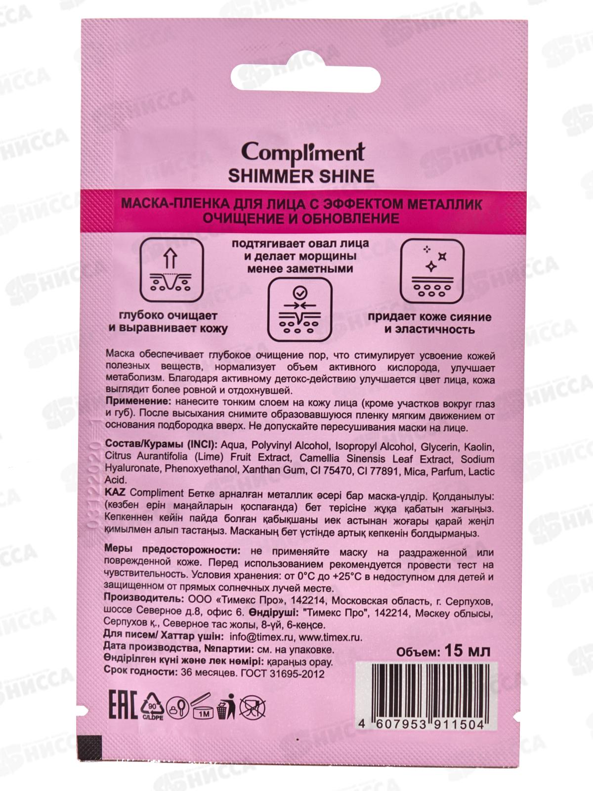 Compliment Shimmer Shine c эффектом металлик Очищение и обновление – продукт премиального класса, выпущенный одним из самых крупных и известных брендов Южной Кореи. Он производится на основе комплекса натуральных экстрактов, витаминов и минералов. Все его компоненты подобраны таким образом, чтобы быстро усваиваться кожей любого типа и моментально давать положительный результат. Compliment Shimmer Shine c эффектом металлик Очищение и обновление убирает с лица шлаки и токсины, сужает поры и делает кожу более молодой. Маска комплексно увлажняет как внешний слой кожи, так и пространство между клетками. Ее можно использовать для лечения и профилактики дегидратации на любой стадии распространения. Продукт укомплектован сертификатом качества международного образца. Он получил положительные отзывы как от дерматологов, так и от косметологов. Единственное возможное противопоказание к применению товара – индивидуальная аллергическая реакция на один из его компонентов.