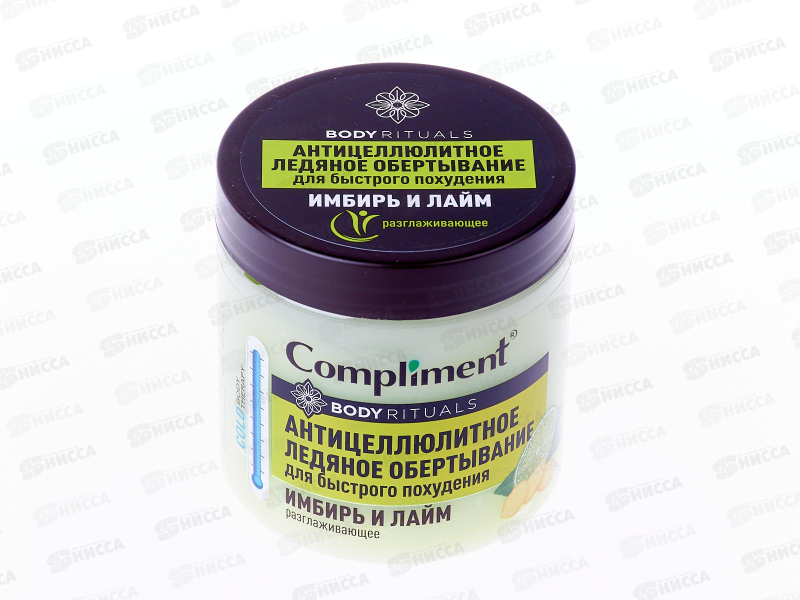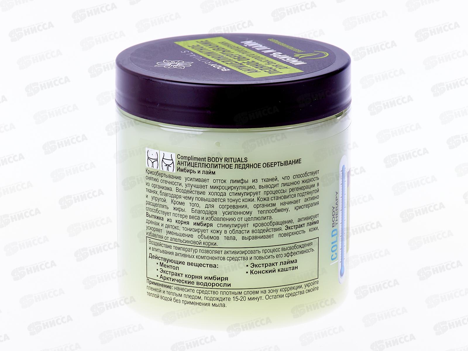 Антицеллюлитное ледяное обертывание, имбирь и лайм Compliment Body Rituals. Криообертывание усиливает отток лимфы из тканей, что способствует снятию отечности, улучшает микроциркуляцию, выводит лишнюю жидкость из организма. Воздействие холода стимулирует процессы регенерации в тканях, благодаря чему повышается тонус кожи. Кожа становится подтянутой и упругой. Кроме того, для согревания, организм начинает активно расщеплять жиры. Благодаря усиленному теплообмену, криотерапия способствует потере веса и избавлению от целлюлита. Вытяжка из корня имбиря стимулирует кровообращение, активирует дренаж и детокс, тонизирует кожу в области воздействия. Экстракт лайма ускоряет уменьшение объемов тела, выравнивает поверхность кожи, избавляя от апельсиновой корки. Применение: нанесите средство плотным слоем на зону коррекции, укройте пленкой и теплым пледом, подождите 15-20 минут. Остатки средства смойте теплой водой без применения мыла. Воздействие температур позволяет активизировать процесс высвобождения и впитывания активных компонентов средства и повысить его эффективность.