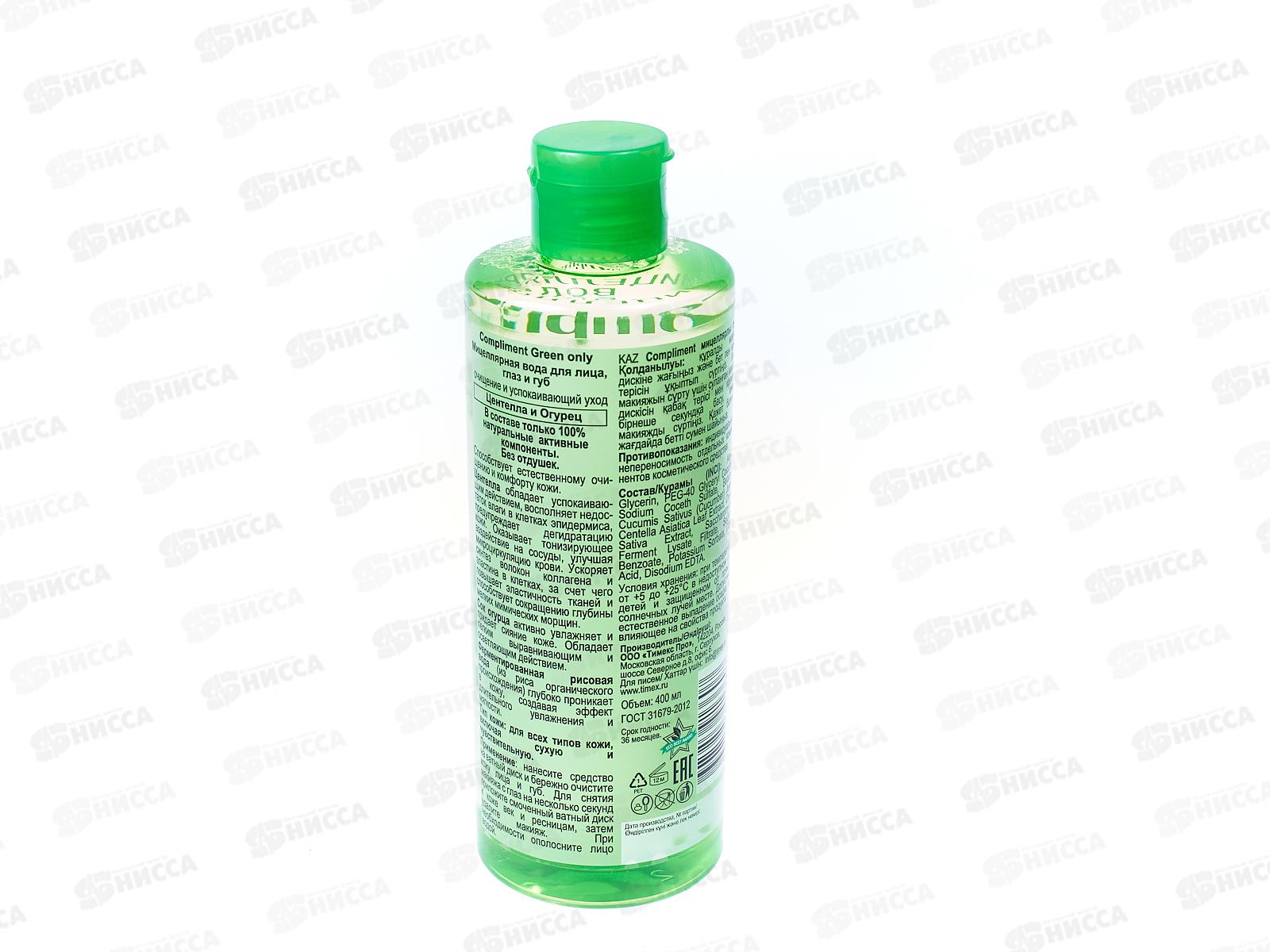 КОМПЛИМЕНТ Green Only Мицеллярная вода для лица глаз и губ очищение и успокаивающий уход 400мл *12