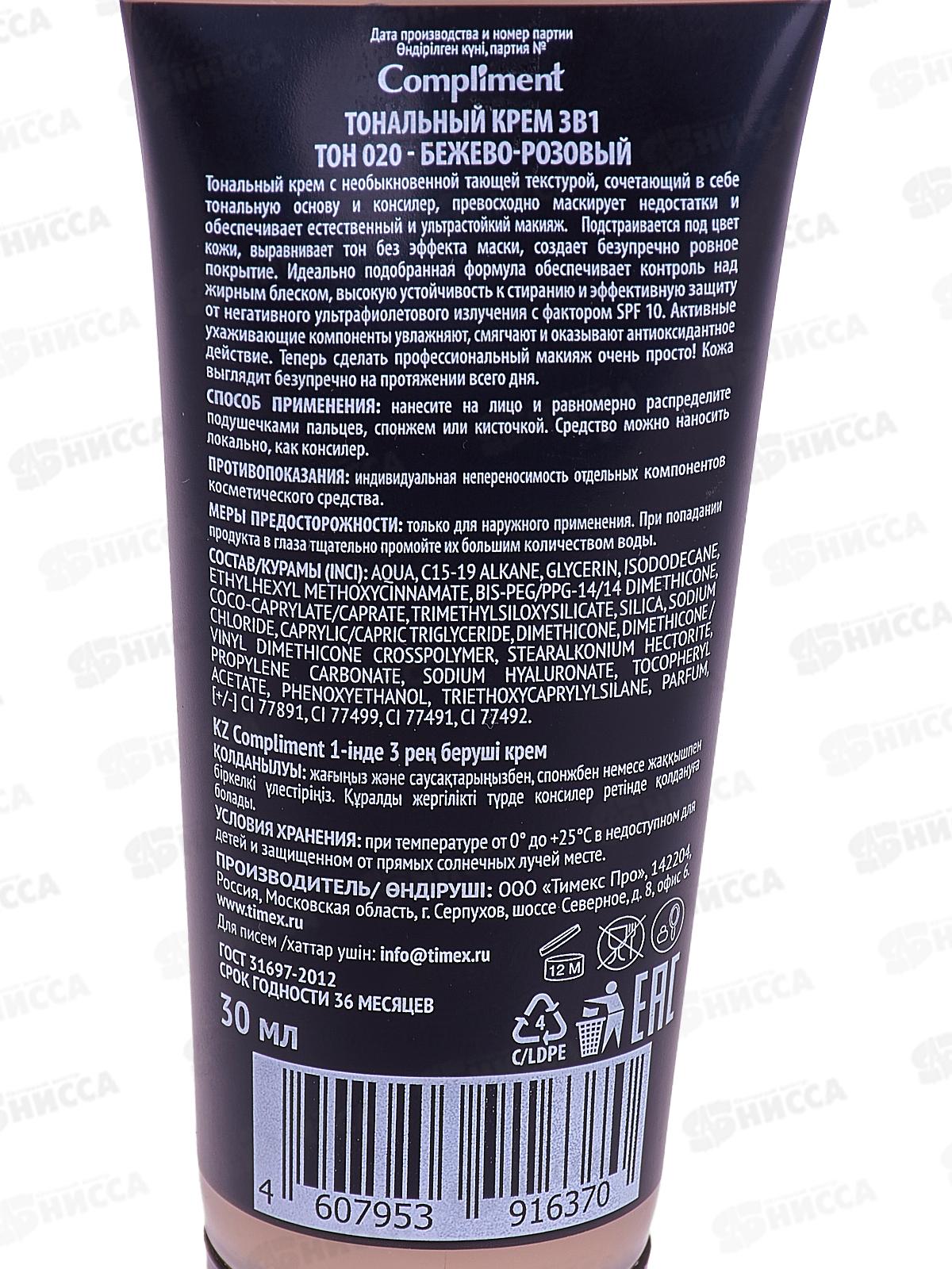 КОМПЛИМЕНТ Тональный крем 3в1 №020 Бежево-розовый 30мл *12