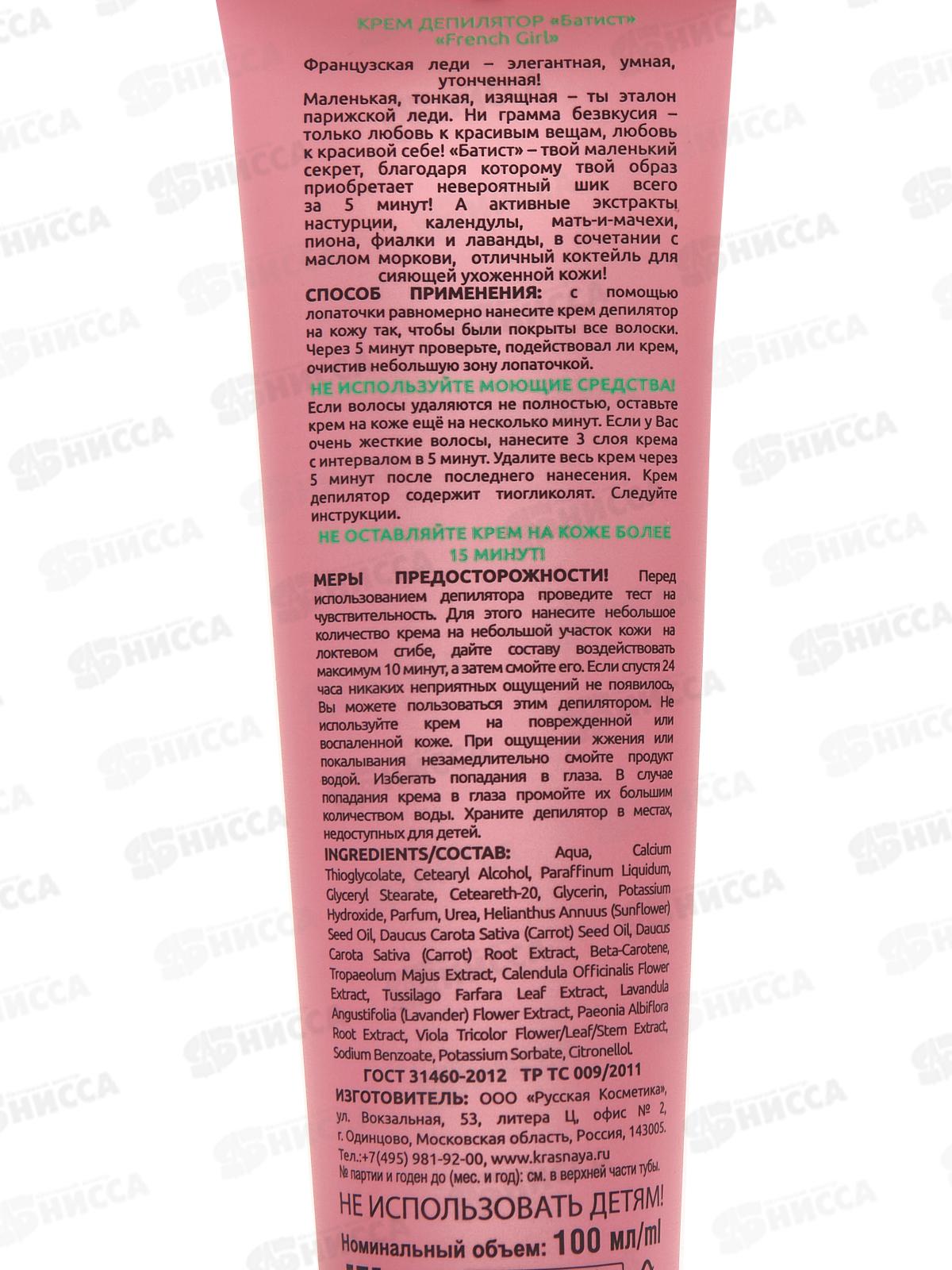 Состав: вода, тиогликолят кальция, цетеариловый спирт, вазелиновое масло, стеарат глицерина, цетеарет-20, глицерин, гидроксид калия, отдушка, мочевина, масло семян подсолнечника (Helianthus Annuus), масло семян моркови (Daucus Carota Sativa), экстракт корня моркови (Daucus Carota Sativa), бета-каротин, экстракт тропеолума большого (Tropeolum Majus), экстракт цветков календулы лекарственной (Calendula Officinalis), экстракт листьев мать-и-мачехи (Tussilago Farfara), экстракт цветков лаванды узколистной (Lavandula Angustifolia), экстракт корня пиона белоцветкового (Paeonia Albiflora), экстракт цветков/листьев/стеблей фиалки трехцветной (Viola Tricolor), бензоат натрия, сорбат калия, цитронеллол.