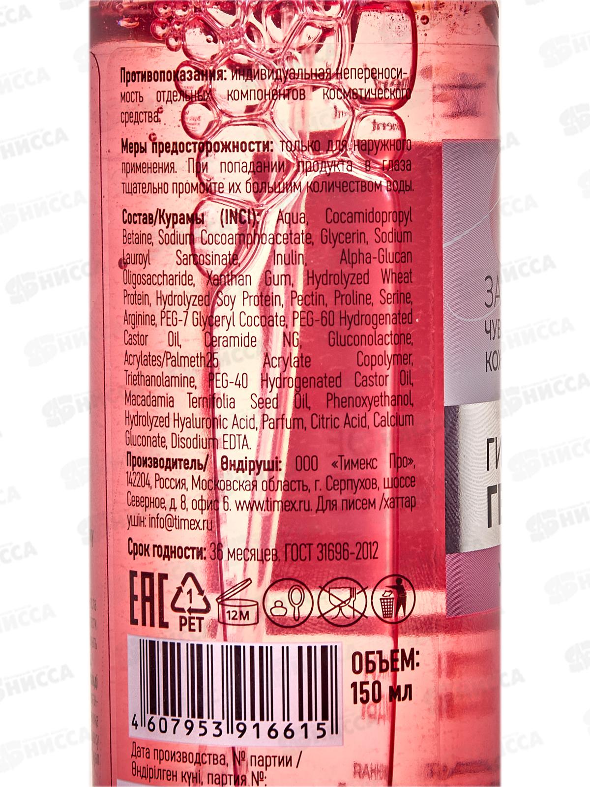 Состав: вода, Кокамидопропилбетаин, кокоамфоацетат натрия, глицерин, лауроилсаркозинат натрия, инулин, альфа-глюкан олигосахарид, ксантановая камедь, гидролизованный пшеничный белок, гидролизованный соевый белок, пектин, пролин, серин, аргинин, глицерил кокоат ПЭГ-7, гидрогенизированное касторовое масло ПЭГ-60, церамид NG, глюконолактон, сополимер акрилатов/пальмет25 акрилата, триэтаноламин, гидрогенизированное касторовое масло ПЭГ-40, масло семян макадамии Ternifolia, феноксиэтанол, гидролизованная гиалуроновая кислота, парфюмерная композиция, лимонная кислота, глюконат кальция, динатриевая соль ЭДТА.