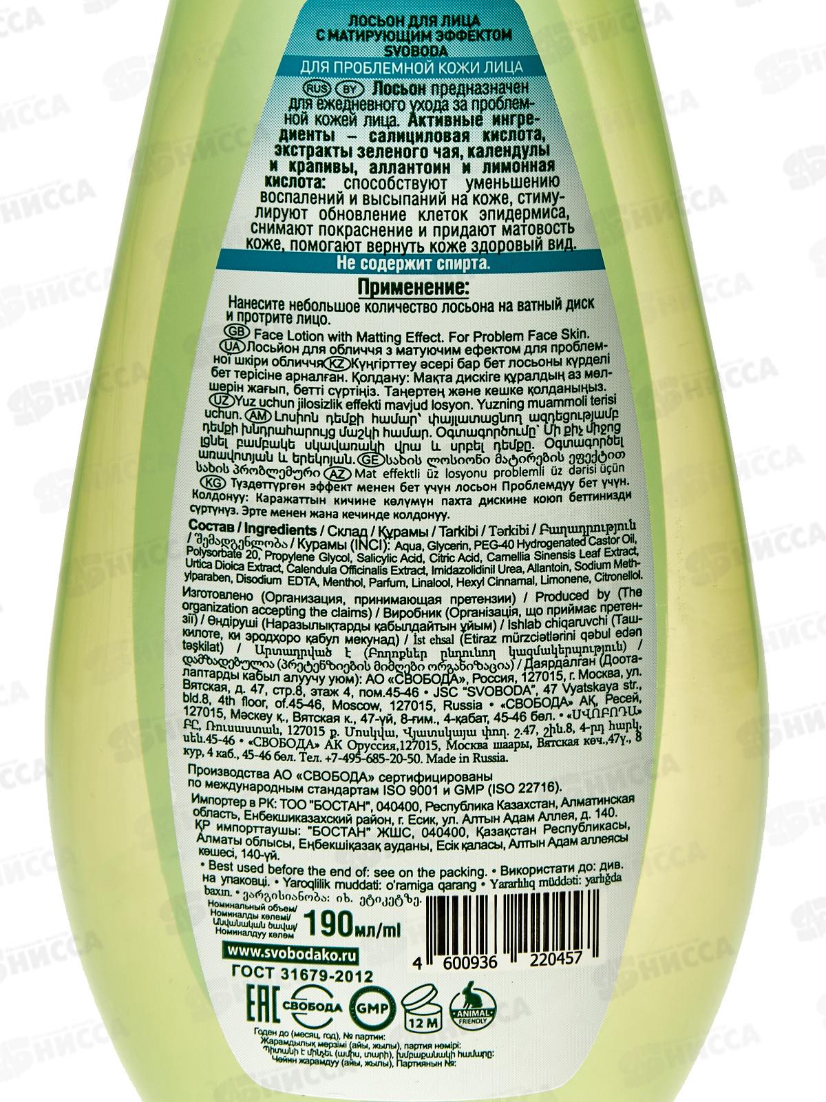 Свобода ЛОСЬОН с матирующим эффектом для проблемной кожи лица 190мл *14