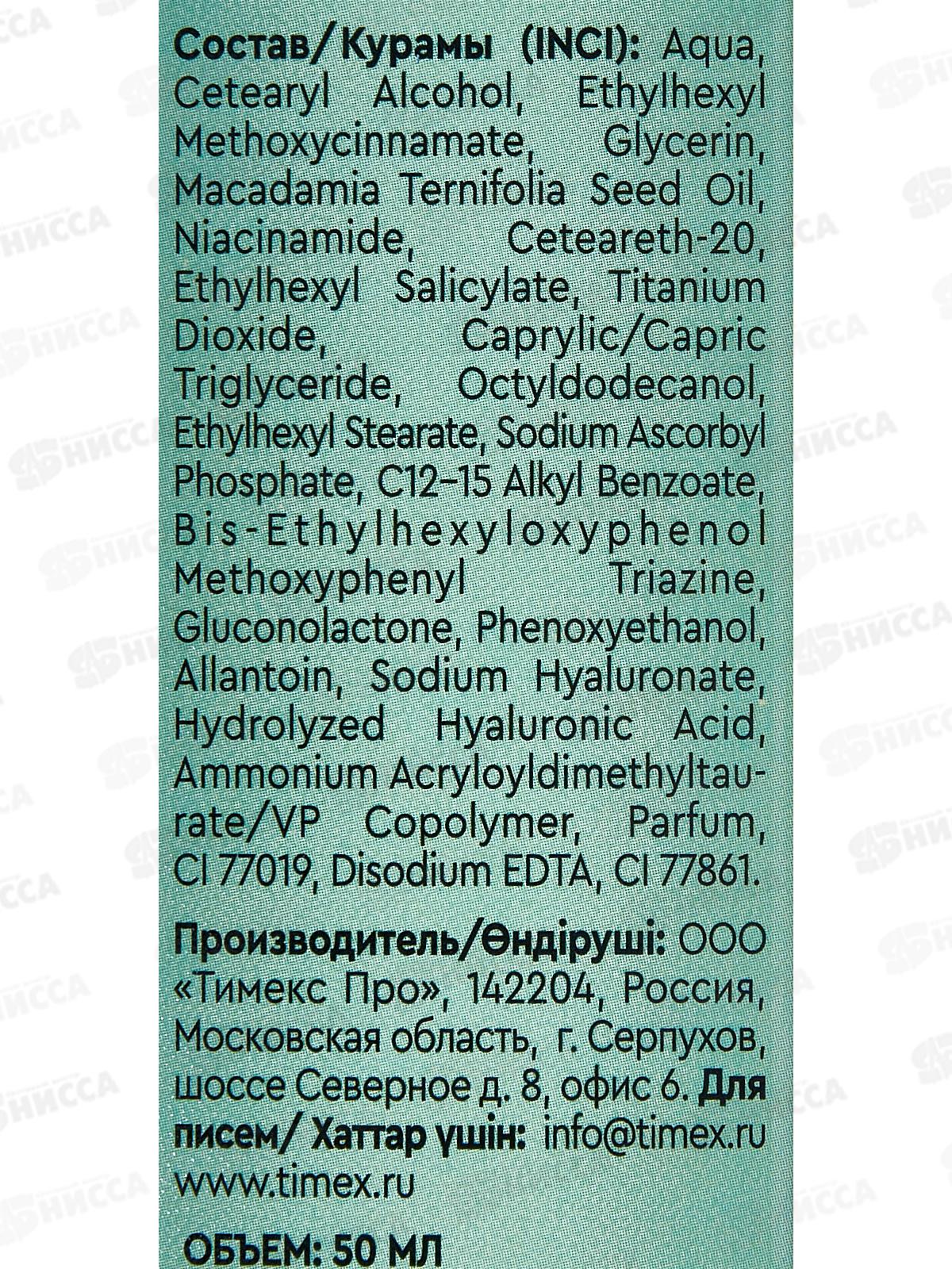 Состав: вода, Цетеариловый спирт, этилгексилметоксициннамат, глицерин, масло семян макадамии Ternifolia, ниацинамид, цетеарет-20, этилгексилсалицилат, диоксид титана, каприловый/каприновый триглицерид, октилдодеканол, этилгексилстеарат, аскорбилфосфат натрия, C12-15 алкилбензоат, бис-этилгексилоксифенол метоксифенил триазин, глюконолактон, феноксиэтанол, аллантоин, гиалуронат натрия, гидролизованная гиалуроновая кислота, сополимер аммония акрилоилдиметилтаурата/ВП, парфюмерная композиция, CI 77019, динатриевая соль ЭДТА, CI 77861.