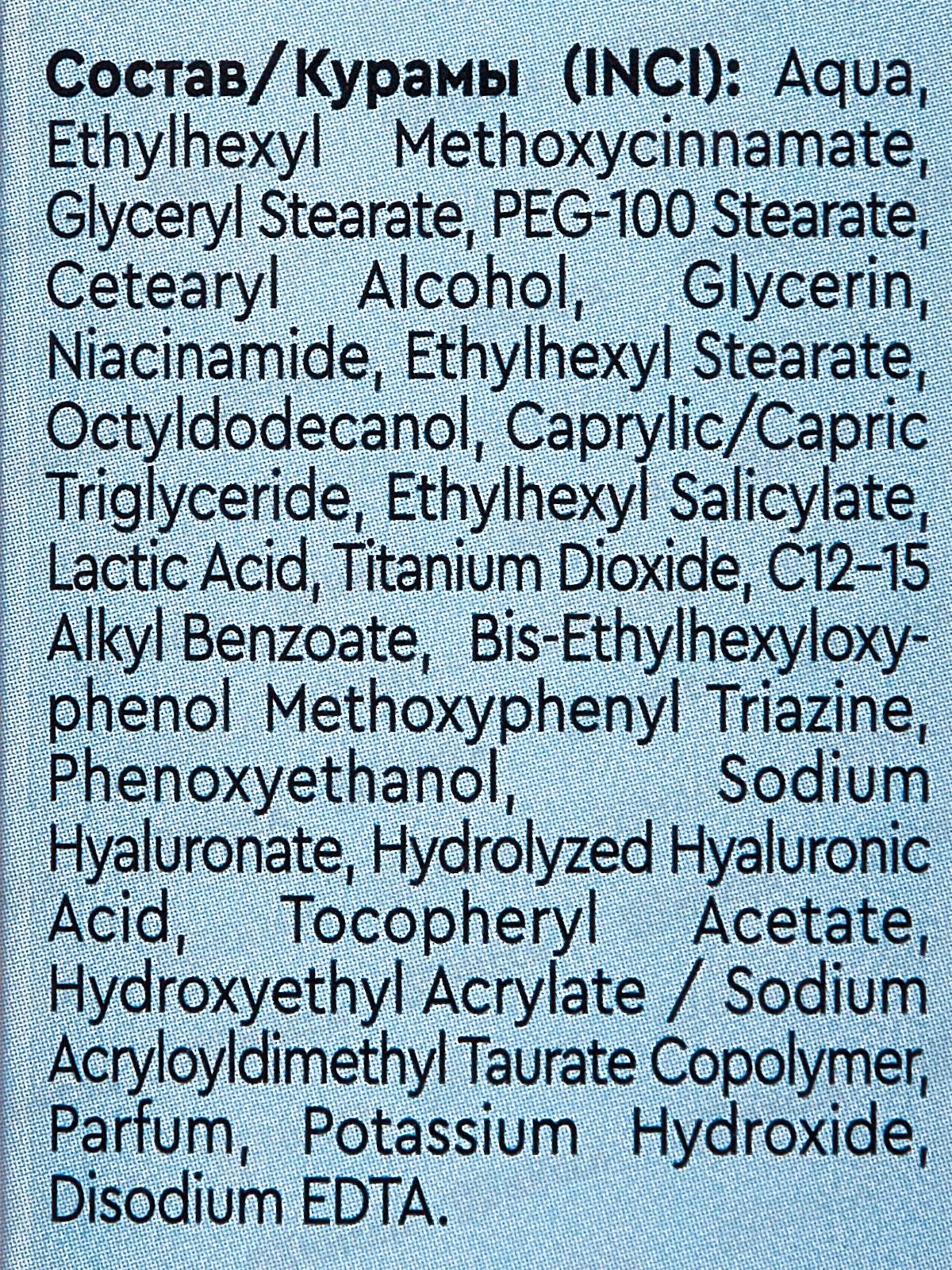 Состав: вода, этилгексилметоксициннамат, глицерилстеарат, стеарат ПЭГ-100, цетеариловый спирт, глицерин, ниацинамид, этилгексилстеарат, октилдодеканол, каприловый/каприновый триглицерид, этилгексилсалицилат, молочная кислота, диоксид титана, C12-15 алкилбензоат, бис-этилгексилоксифенолметоксифенилтриазин, феноксиэтанол, гиалуронат натрия, гидролизованная гиалуроновая кислота, токоферилацетат, сополимер гидроксиэтилакрилата/акрилоилдиметилтаурата натрия, парфюмерная композиция, гидроксид калия, динатриевая соль ЭДТА.