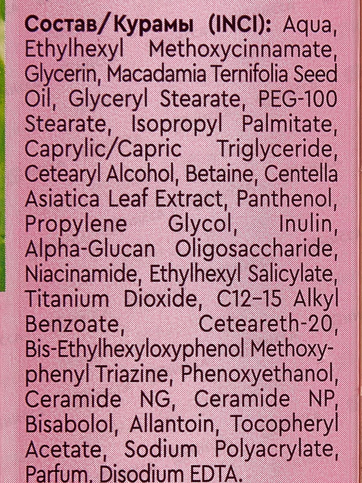 Состав: вода, Этилгексилметоксициннамат, Глицерин, Масло семян макадамии трехлистной, глицерилстеарат, стеарат ПЭГ-100, изопропилпальмитат, триглицерид каприловой кислоты, цетеариловый спирт, Бетаин, Экстракт листьев центеллы Азиатской, Пантенол, Пропиленгликоль Инулин, олигосахарид Альфа-глюкана, ниацинамид, этилгексилсалицилат, Диоксид титана, алкилбензоат С12-15., Цетеарет-20, Бис-этилгексилоксифенол метокси-фенилтриазин, феноксиэтанол, Керамид NG, Керамид NP, Бисаболол, аллантоин, токоферилацетат, полиакрилат натрия, Парфюмированная вода. Динатриевый ЭДТА.