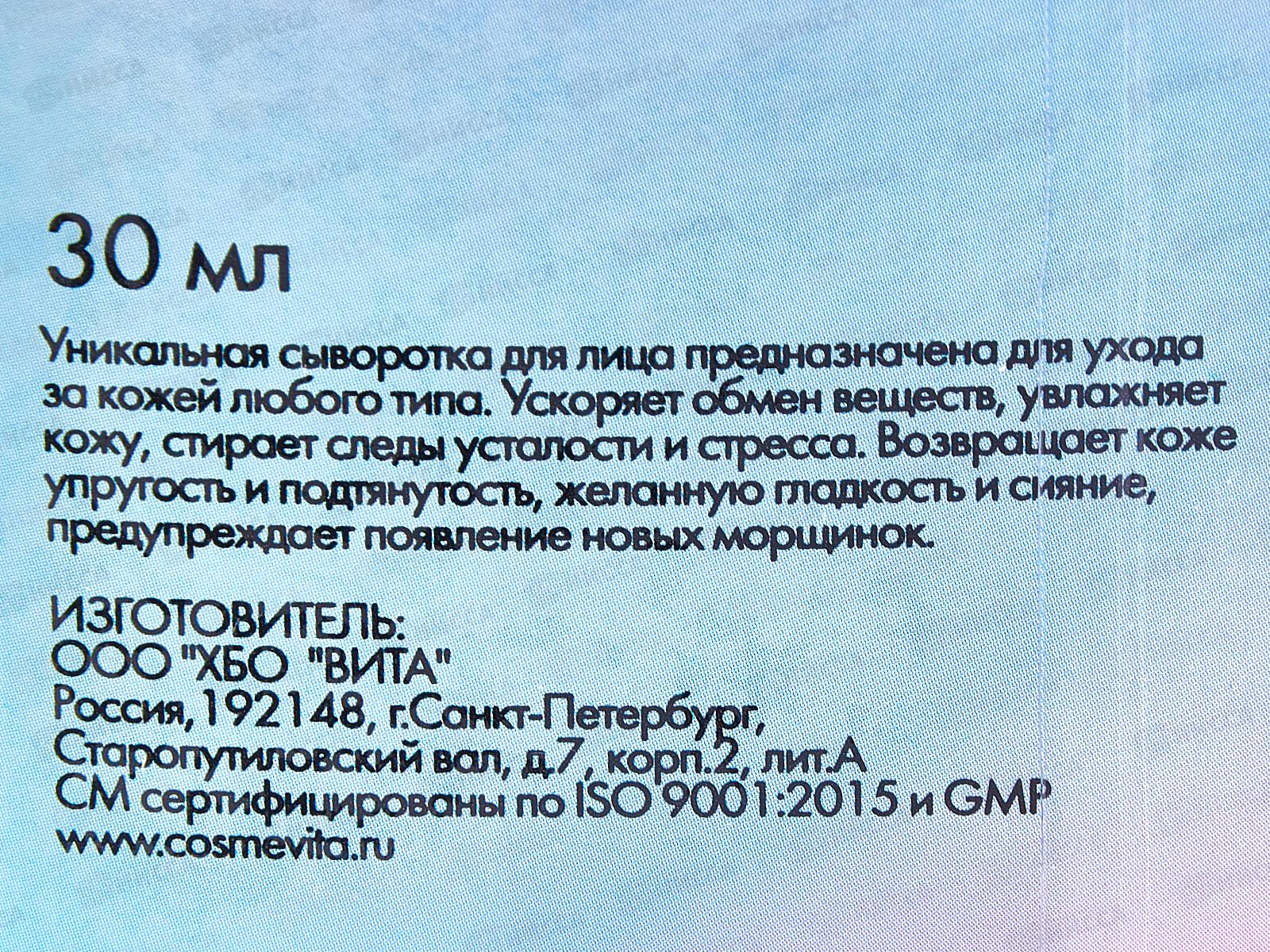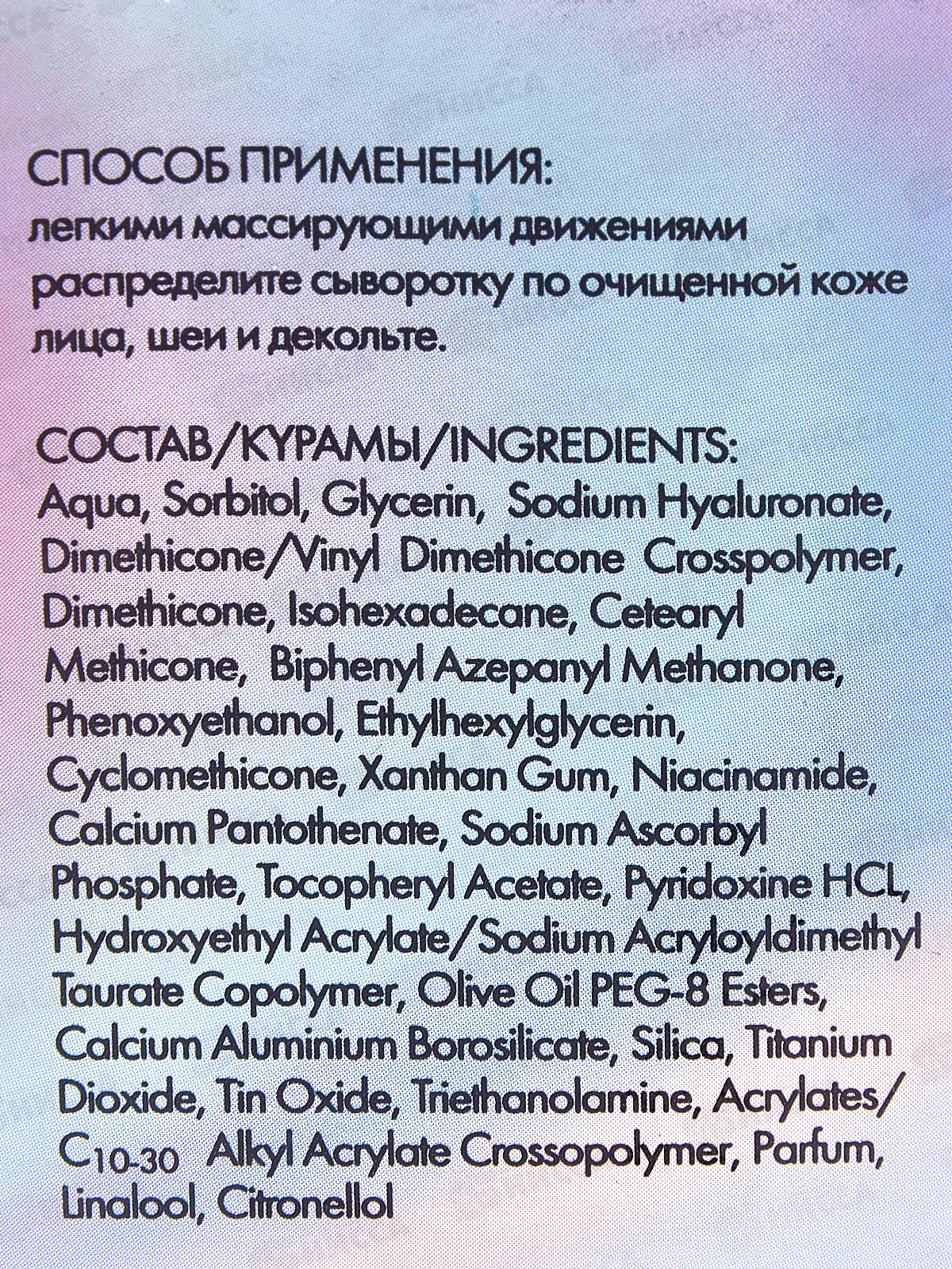 Состав: вода, сорбитол, глицерин, гиалуронат натрия, диметикон/винил диметикон кроссполимер, диметикон, изогексадекан, цетеарил метикон, дифенилдиметикон, бифенилазепанилметанон, феноксиэтанол, этилгексилглицерин, циклометикон, ксантановая смола, ниацинамид, кальция пантотенат, аскорбилфосфат натрия, токоферола ацетат, пиридоксина гидрохлорид, сополимер гидроксиэтилакрилата и акрилоилдиметилтаурата натрия, масло авокадо водорастворимое, кальция алюминия боросиликат, пигмент пурпурный, триэтаноламин, акрилат/С10-30-алкил акрилат кроссполимер, парфюмерная композиция, линалоол, цитронеллол.