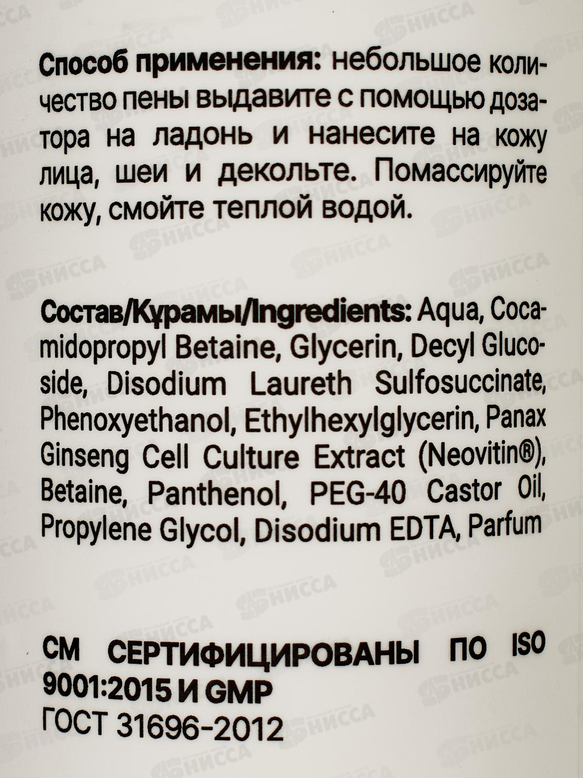 Состав: вода, кокамидопропилбетаин, глицерин, децилглюкозид, динатрия лауретсульфосукцинат, феноксиэтанол, этилгексилглицерин, экстракт культуры клеток женьшеня (Neovitin®), бетаин, пантенол, ПЭГ-40 касторовое масло, пропиленгликоль, динатрия ЭДТА, отдушка.