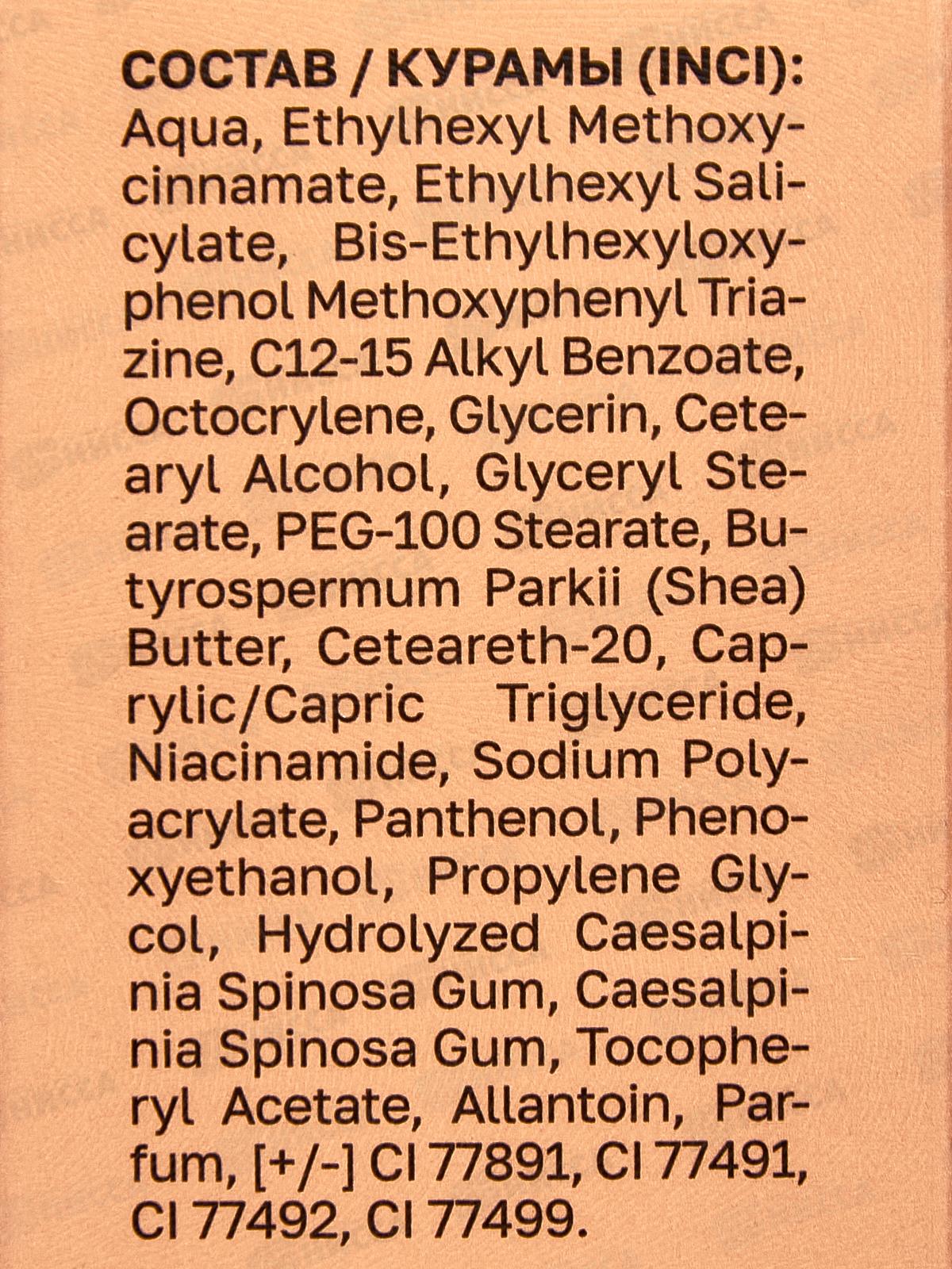 Состав: вода, этилгексилметоксициннамат, этилгексилсалицилат, бис-этилгексилоксифенолметоксифенилтриазин, C12-15 алкилбензоат, октокрилен, глицерин, цетеариловый спирт, глицерилстеарат, ПЭГ-100 стеарат, масло ши (Bumyrospermum Parkii), цетеарет-20, каприловый/каприновый триглицерид, ниацинамид, полиакрилат натрия, пантенол, феноксиэтанол, пропиленгликоль, гидролизованная камедь цезальпинии колючей, камедь цезальпинии колючей, токоферилацетат, аллантоин, парфюмерная композиция, [+/-] CI 77891, CI 77491, CI 77492, CI 77499.