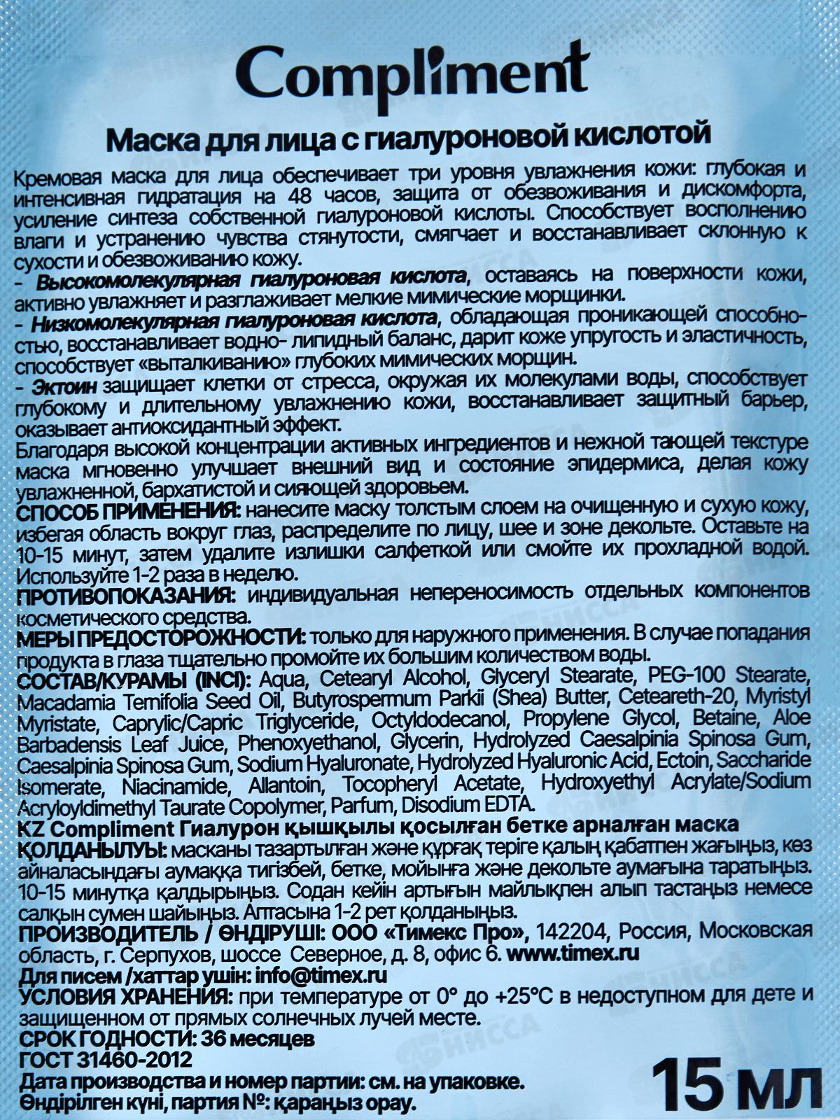 КОМПЛИМЕНТ Саше маска для лица с гиалуроновой кислотой 15мл
