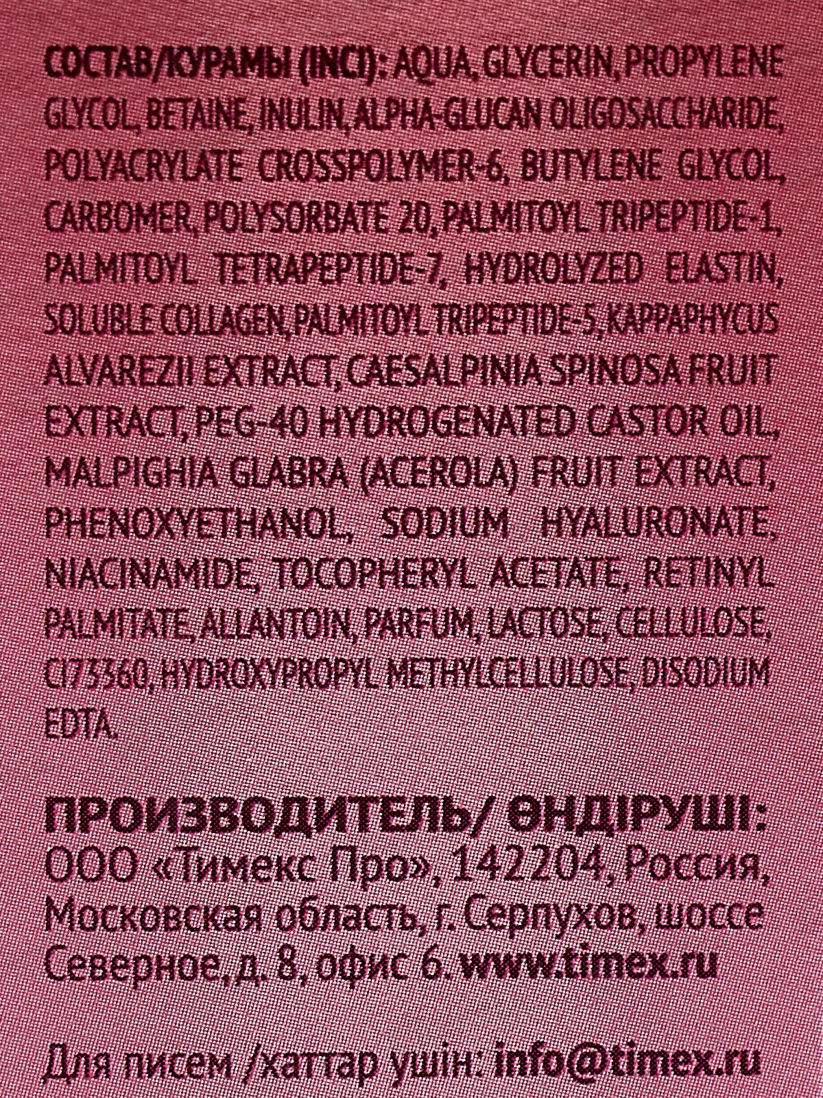 Состав: вода, Глицерин, пропиленгликоль, бетаин, инулин, альфа-глюкан олигосахарид, полиакрилат кроссполимер-6, бутиленгликоль, карбомер, полисорбат 20, пальмитоил трипептид-1, пальмитоил тетрапептид-7, гидролизованный эластин, растворимый коллаген, пальмитоил трипептид-5, экстракт Kappaphycus Alvarezii, экстракт плодов Caesalpinia Spinosa, гидрогенизированное касторовое масло PEG-40, экстракт плодов Malpighia Glabra (Acerola), феноксиэтанол, гиалуронат натрия, ниацинамид, токоферилацетат, ретинилпальмитат, аллантоин, парфюмерная композиция, лактоза, целлюлоза, CI73360, гидроксипропилметилцеллюлоза, динатриевая соль ЭДТА.