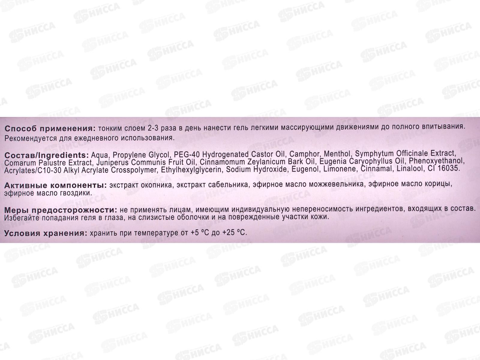 Состав: вода, Пропиленгликоль, ПЭГ-40 гидрогенизированное касторовое масло, камфора, ментол, экстракт окопника лекарственного, экстракт сабельника болотного, масло плодов можжевельника обыкновенного, масло коры коричного дерева, масло эвгении гвоздичной, феноксиэтанол, кроссполимер акрилатов/C10-30 алкилакрилата, этилгексилглицерин, гидроксид натрия, эвгенол, лимонен, циннамаль, линалоол, CI 16035.