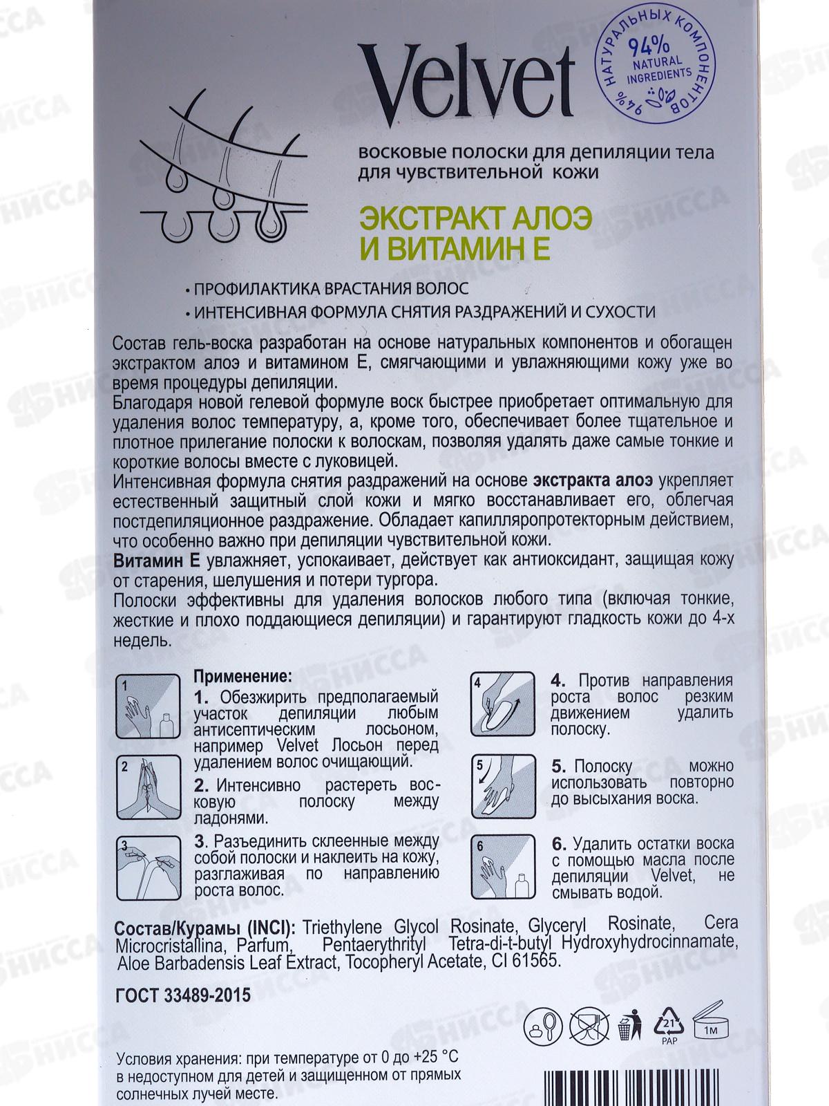 ВЕЛЬВЕТ Восковые полоски для тела Экст Алоэ м витамин Е 20шт *12