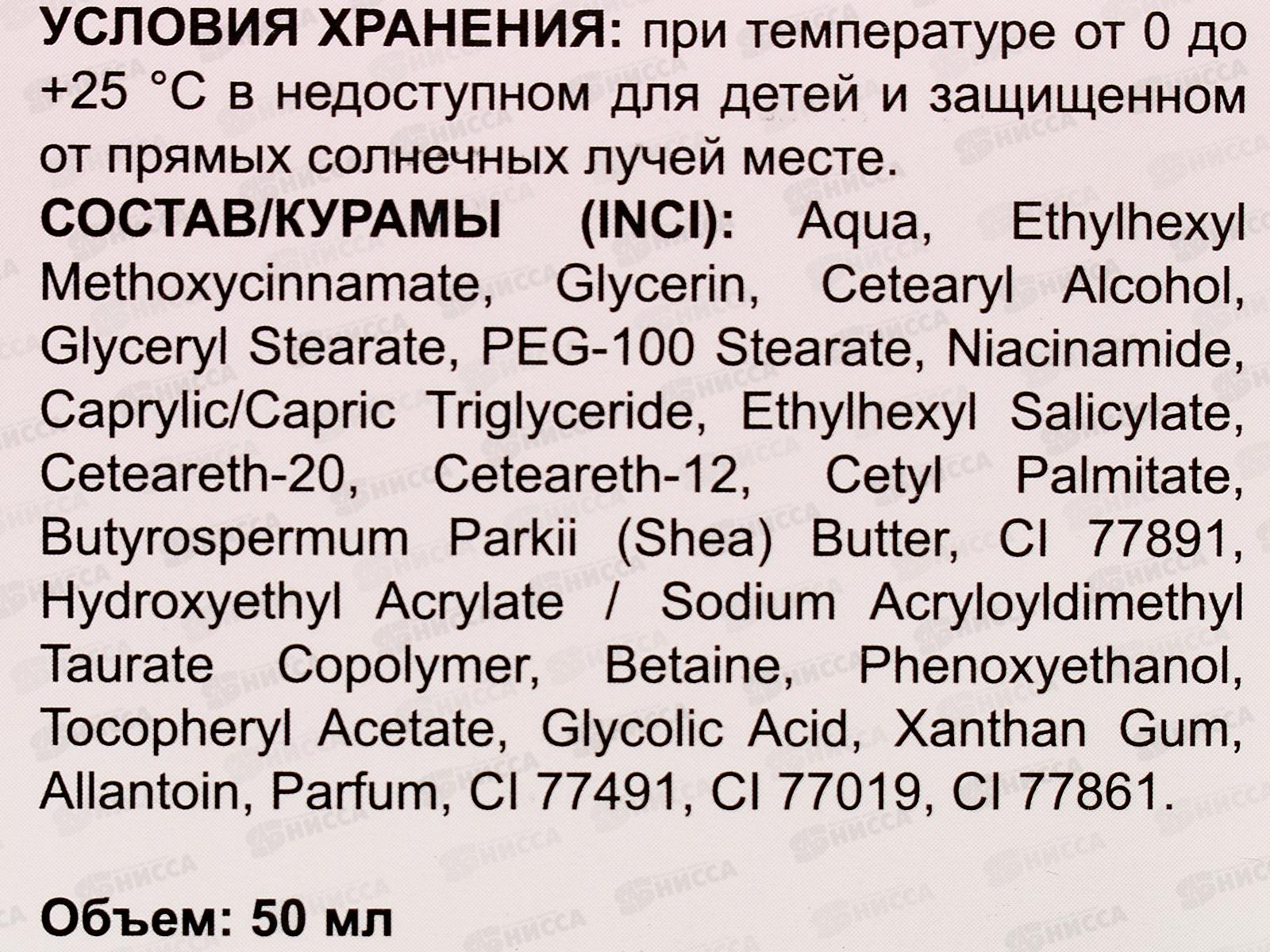 Состав: вода, Этилгексилметоксициннамат, Глицерин, Цетеариловый спирт, Глицерилстеарат, ПЭГ-100 Стеарат, Ниацинамид, Каприлик/каприк триглицериды, Этилгексилсалицилат, Цетеарет-20, Цетеарет-12, Цетилпальмитат, Масло Ши, CI 77891, Гидроксиэтилакрилат / сополимер акрилоилдиметил таурата натрия, Бетаин, Феноксиэтанол, Токоферилацетат, Гликолевая кислота, Ксантановая камедь, Аллантоин, Отдушка, CI 77491, CI 77019, CI 77861