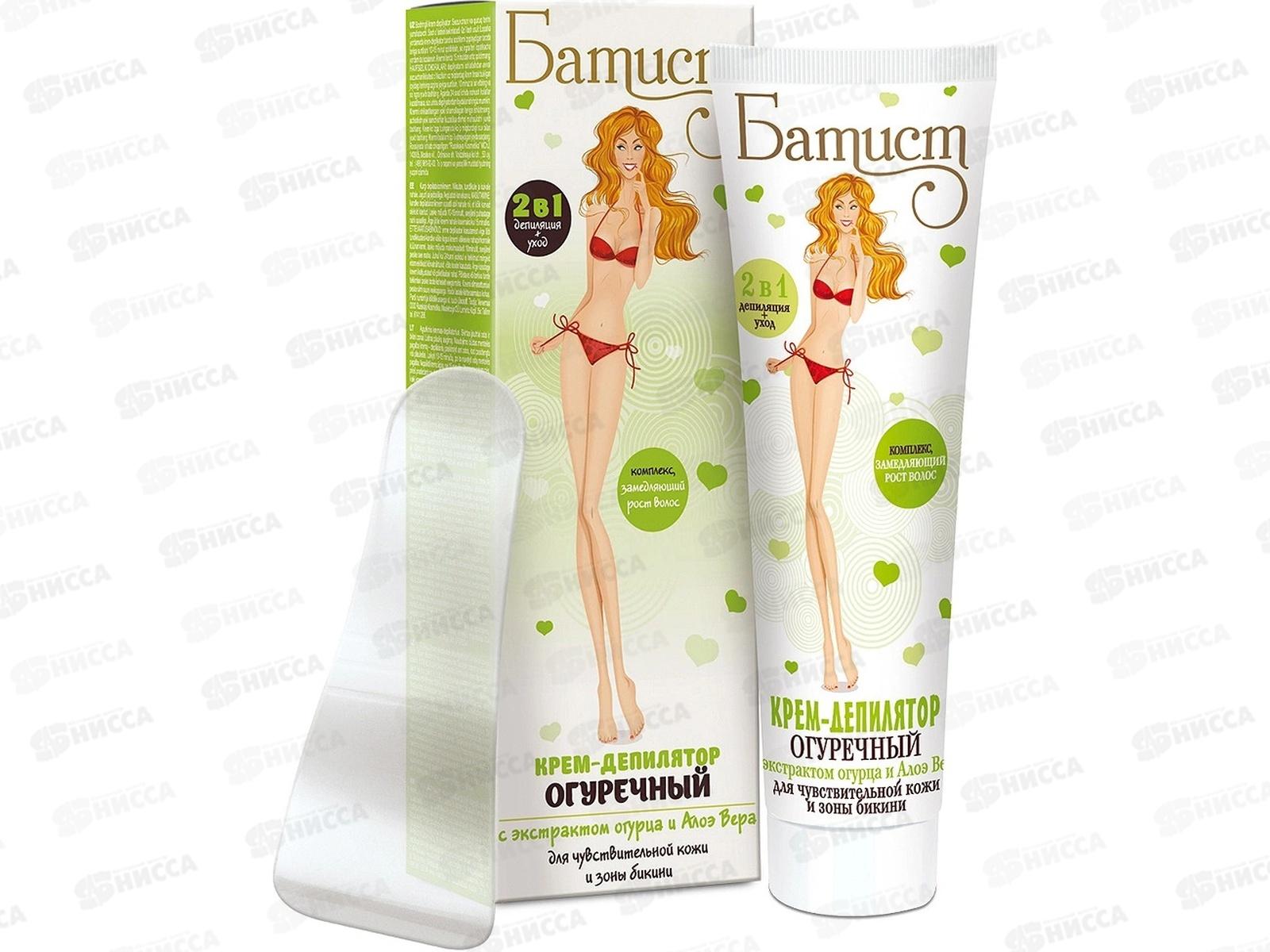 Огуречный крем-депилятор для чувствительной кожи и зоны бикини, который содержит активный натуральный комплекс на основе экстрактов листьев папайи, хмеля и шалфея, замедляющий дальнейший рост волос на длительное время.Крем-депилятор «Батист» поможет Вам удалить все нежелательные волоски легко, быстро и надолго, при этом даря удовольствие от процесса и результата. Уже через 5 минут после нанесения активные компоненты крема начинают разрушать волосы легко и безболезненно.В состав крема-депилятора входят экстракты огурца и алоэ вера, которые оказывают освежающее и увлажняющее действие на кожу.С кремом-депилятором Батист Вы будете наслаждаться необычайной удивительной гладкостью и нежностью кожи день за днем. Способ применения. С помощью лопаточки равномерно нанесите крем-депилятор на кожу так, чтобы были покрыты все волоски. Через 5 минут проверьте, подействовал ли крем, очистив небольшую зону лопаточкой. Если волосы легко удаляются, очистите кожу от крема с помощью лопаточки, затем смойте прохладной водой. Не используйте моющие средства! Если волосы удаляются не полностью, оставьте крем на коже ещё на несколько минут. Если у Вас очень жесткие волосы, нанесите 3 слоя крема с интервалом в 5 минут. Удалите весь крем через 5 минут после последнего нанесения. Крем-депилятор содержит тиогликолят. Следуйте инструкции. Не оставляйте крем на коже более 15 минут! После применения крема-депилятора рекомендуется использовать крем после депиляции Батист. Меры предосторожности! Перед использованием депилятора проведите тест на чувствительность. Для этого нанесите небольшое количество крема на небольшой участок кожи на локтевом сгибе, дайте составу воздействовать максимум 10 минут, а затем смойте его. Если спустя 24 часа никаких неприятных ощущений не появилось, Вы можете пользоваться этим депилятором. Не используйте крем на поврежденной или воспаленной коже. При ощущении жжения или покалывания незамедлительно смойте продукт водой. Избегать попадания в глаза. В случае попадания крема в глаза промойте их большим количеством воды. Храните депилятор в местах, недоступных для детей.