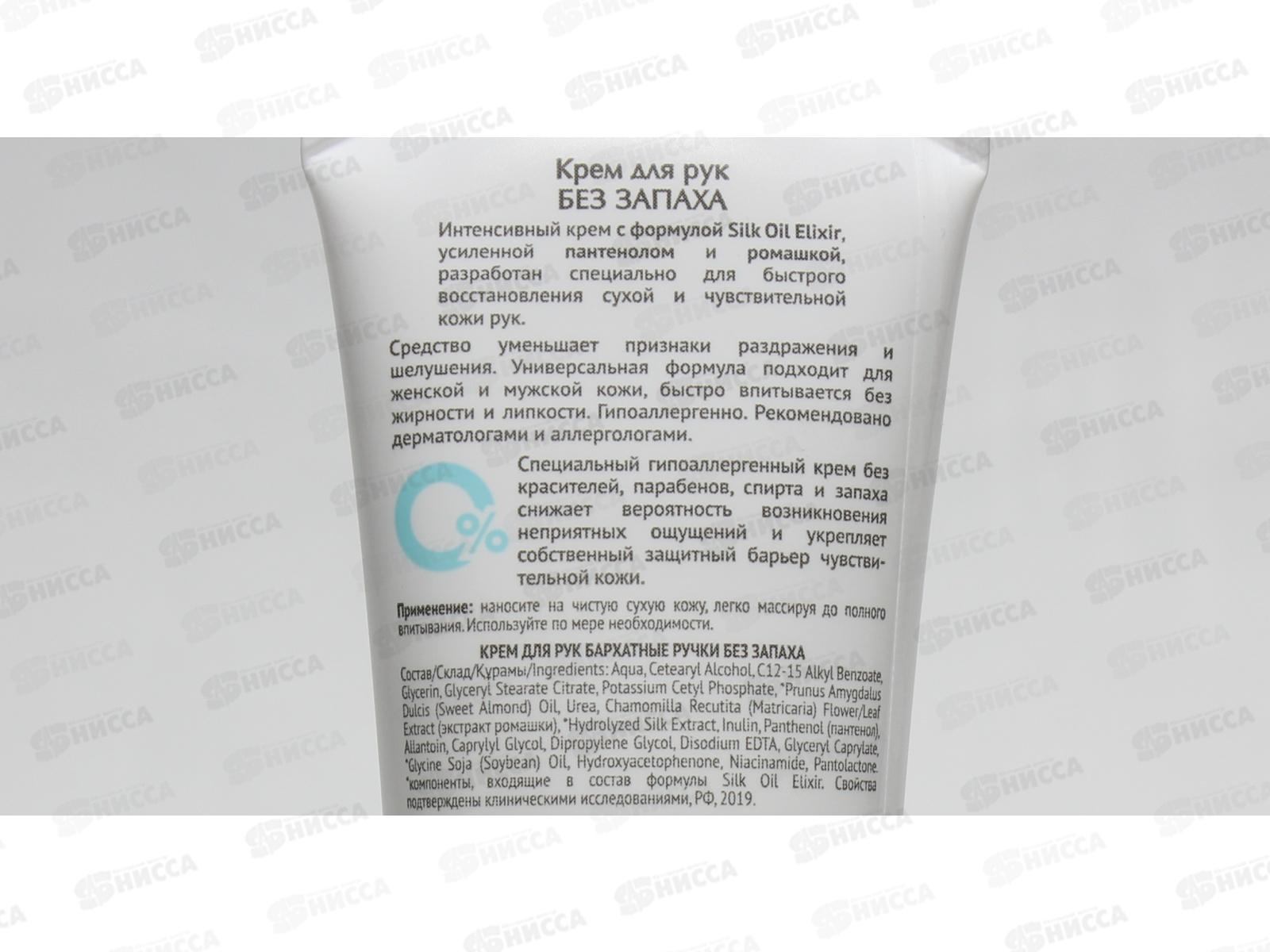 Сухая и чувствительная кожа рук требует специального и бережного ухода. Интенсивный крем с формулой Silk Oil Elixir, усиленной пантенолом и ромашкой, разработан специально для быстрого восстановления сухой и чувствительной кожи рук. Отдушки могут являться катализатором аллергии. Многие потребители не могут использовать крема с ярко-выраженным запахом из-за аллергической реакции. Крем Бархатные ручки не содержит отдушки и является гипоаллергенным, подходит для использования в сезон аллергии. Продукт рекомендован дерматологами и аллергологами.