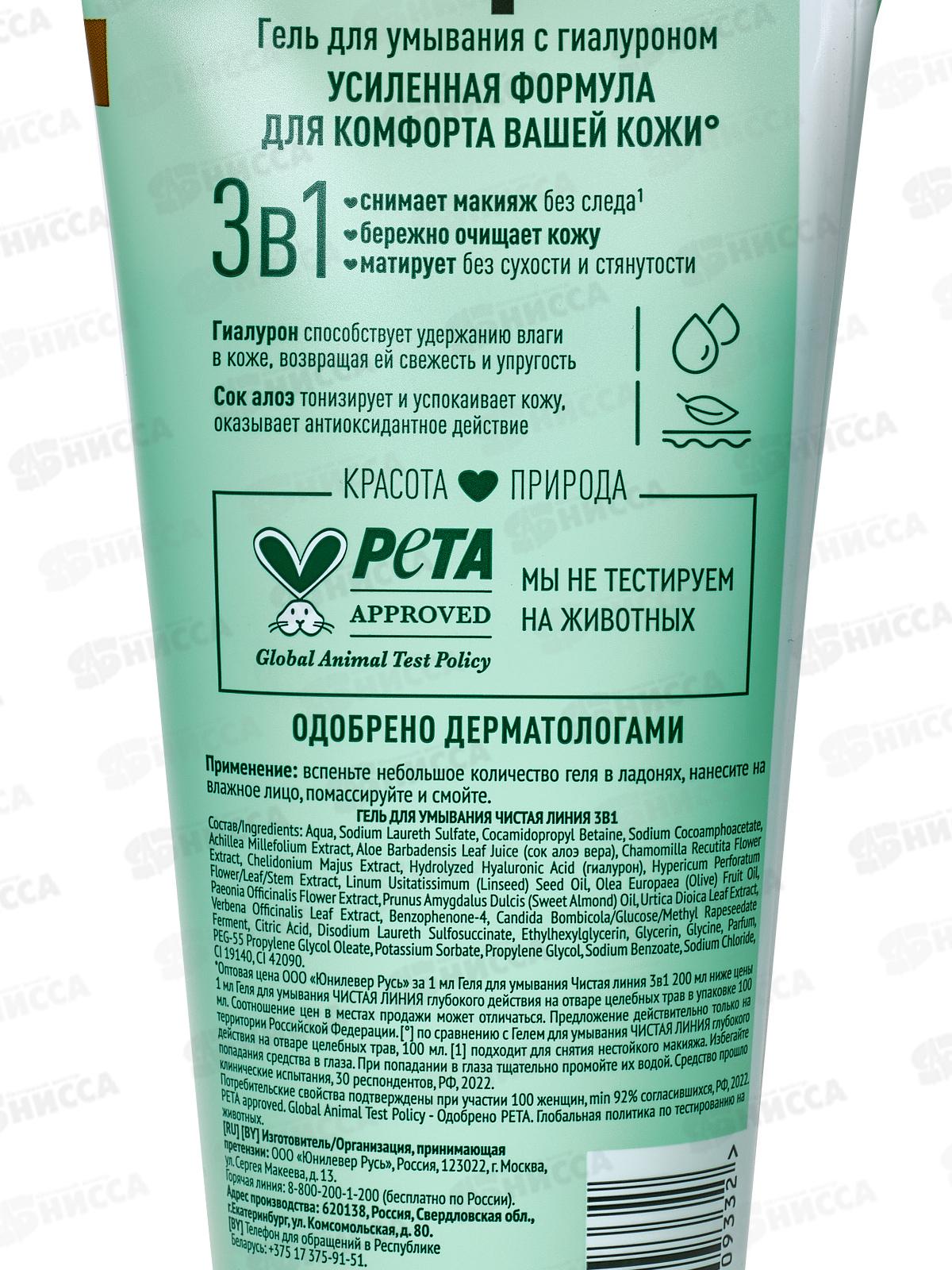 Концерн Калина Чистая Линия гель для умывания 3в1 С гиалуроном и соком алоэ 200мл *8