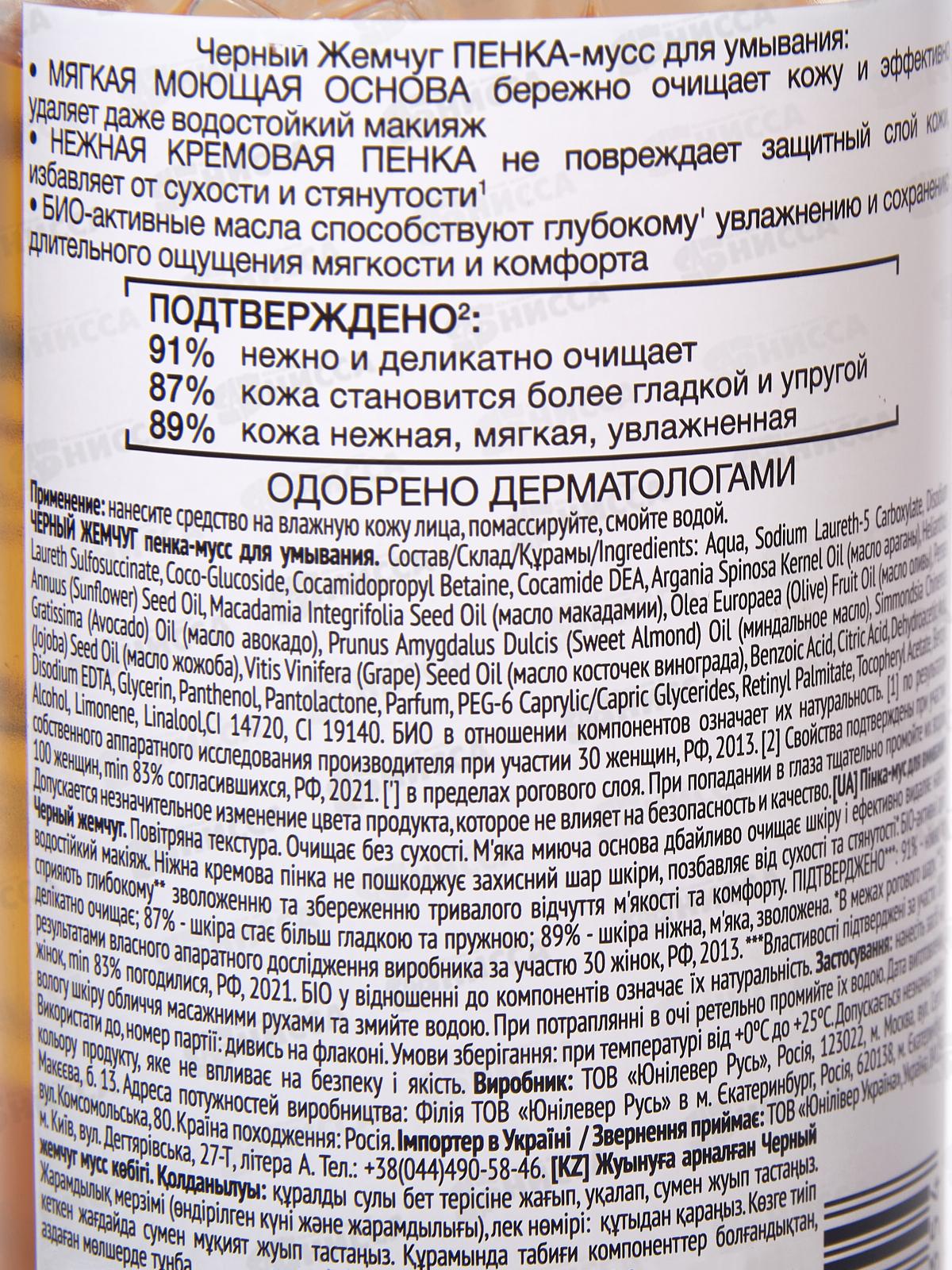 Пенка-мусс для умывания с водой линейки "Драгоценные масла" – это средство для умывания, которое не просто очищает кожу, а дарит по-настоящему деликатный уход, избавляя кожу от сухости и стянутости. Пенка для умывания содержит ПРО-витамины и комплекс из 7 био-активных натуральных масел, которые способствуют глубокому увлажнению и сохранению длительного ощущения мягкости и комфорта. Масло винограда является мощным натуральным антиоксидантом, а также обладает увлажняющим действием, стабилизирует выработку коллагена, эластина и гиалурона. Масло арганы глубоко увлажняет кожу и обладает регенерирующим и омолаживающим свойством. Масло жожоба богато витаминами, прежде всего витамином Е и минеральными веществами, которые оказывают антиоксидантное, противовоспалительное и восстанавливающее действие. Масло легко всасывается в кожу, поддерживая защитную функцию кожных покровов и оказывая омолаживающее действие. Масло макадамии богато витаминами группы В, ненасыщенными жирными кислотами, оно смягчает кожу, питает её и является натуральным UV-фильтром. Миндальное масло оказывает тонизирующее и увлажняющее действие, а также делает кожу более упругой и эластичной. Масло оливы помогает сохранить влагу в коже, оказывает смягчающее действие. Мягкая моющая основа пенки бережно очищает кожу от загрязнений и эффективно удаляет даже водостойкий макияж. Пенка имеет легкую воздушную текстуру, которая точно подарит удовольствие в процессе очищения кожи и не повредит её защитный барьерный слой во время умывания. После использования средства поры очищены, а кожа дышит, становится более гладкой и матовой. Био-масло для умывания Черный Жемчуг одобрено дерматологами.
