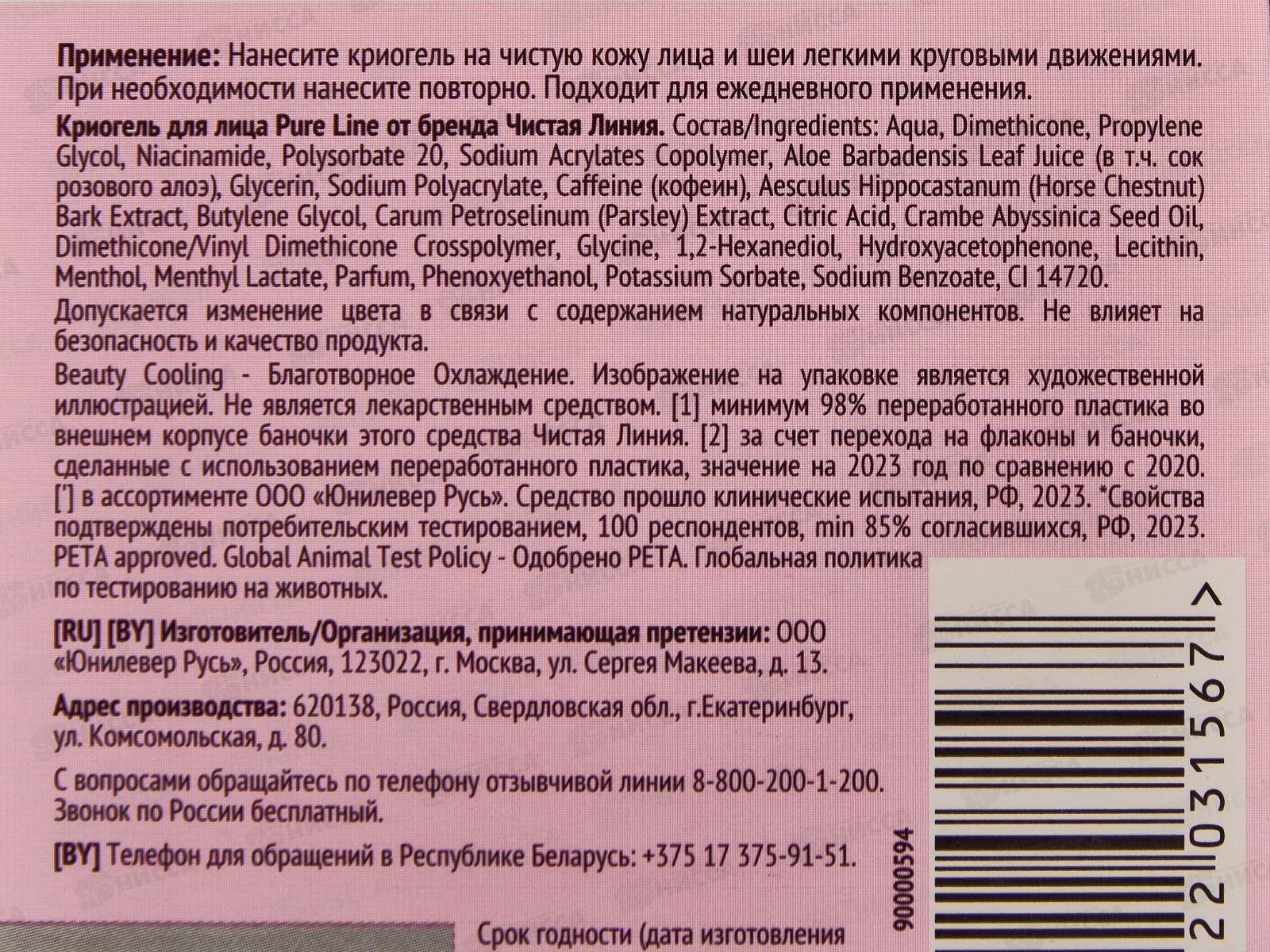 Концерн Калина Чистая Линия PL Криогель для лица 45мл *12
