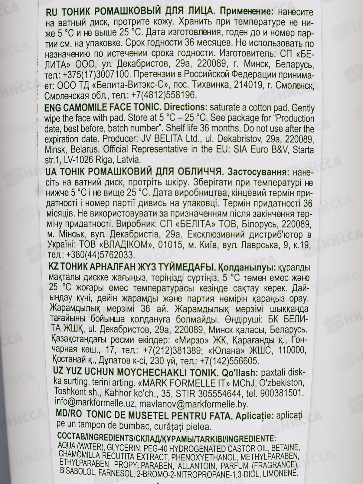 Тоник завершает процесс очищения кожи, оказывает длительное увлажняющее, освежающее и тонизирующее действие. Благодаря аллантоину и бисабололу успокаивает и восстанавливает кожу, оказывает антисептическое и противовоспалительное действие. Состав: Вода, глицерин, ПЭГ-40 гидрогенизированное касторовое масло, бетаин, экстракт Chamomilla Recutita (ромашки), феноксиэтанол, метилпарабен, этилпарабен, пропилпарабен, аллантоин, парфюмерная композиция, бисаболол, фарнезол, 2-бром-2-нитропропан-1,3-диол, лимонен.