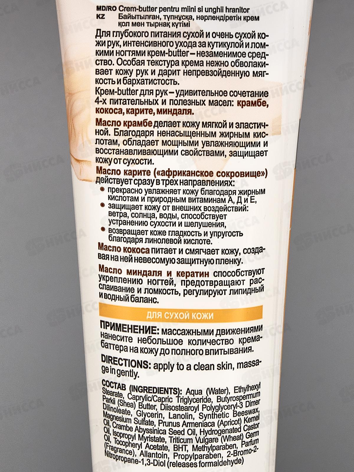 Для глубокого питания сухой и очень сухой кожи рук, интенсивного ухода за кутикулой и ломкими ногтями крем-butter — незаменимое средство. Особая текстура крема нежно обволакивает кожу рук и дарит непревзойденную мягкость и бархатистость. Состав: вода, цетеариловый спирт, полисорбат-60, ПЭГ-100 стеарат, цетеарет-25, глицерин, циклопентасилоксан, циклогексасилоксан, масло Prunus Amygdalus Dulcis (сладкого миндаля), масло Cocos Nucifera (кокосовое), ланолин, миристиллактат, масло Butyrospermum parkii (ши), масло семян Crambe Abyssinica, сополимер акрилоилдиметилтаурата аммония и винилпирролидона, парфюмерная композиция, метилпарабен, изопропилмиристат, масло зародышей Triticum vulgare (пшеницы), токоферилацетат, БГТ, пропилпарабен, гидролизованный кератин, 2-бром-2-нитропропан-1,3-диол.