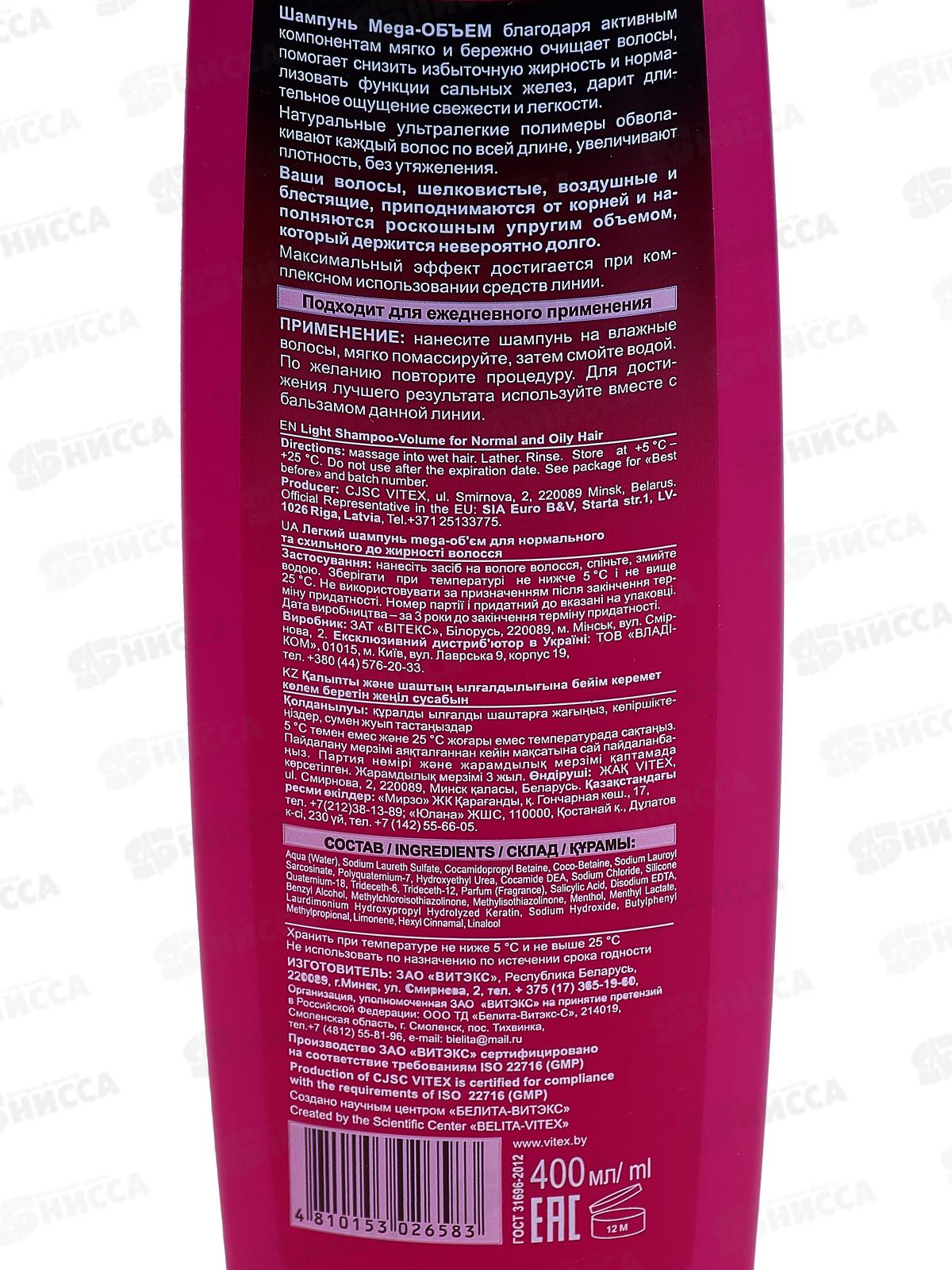Шампунь Mega-ОБЪЕМ благодаря активным компонентам мягко и бережно очищает волосы, помогает снизить избыточную жирность и нормализовать функции сальных желез, дарит длительное ощущение свежести и легкости. Натуральные ультралегкие полимеры обволакивают каждый волос по всей длине, увеличивают плотность, без утяжеления. Состав: вода, лауретсульфат натрия, кокамидопропилбетаин, кокобетаин, лауроилсаркозинат натрия, поликватерниум-7, гидроксиэтилмочевина, кокамид ДЭА, хлорид натрия, силикон кватерниум-18, тридецет-6, тридецет-12, папрфюмерная композиция, салициловая кислота, ЭДТА динатрия, бензиловый спирт, метилхлоризотиазолинон, метилизотиазолинон, ментол, ментиллактат, гидроксипропилгидролизованный кератин лаурдимония, гидроксид натрия, бутилфенилметилпропиональ, лимонен, гексилциннамаль, линалол.