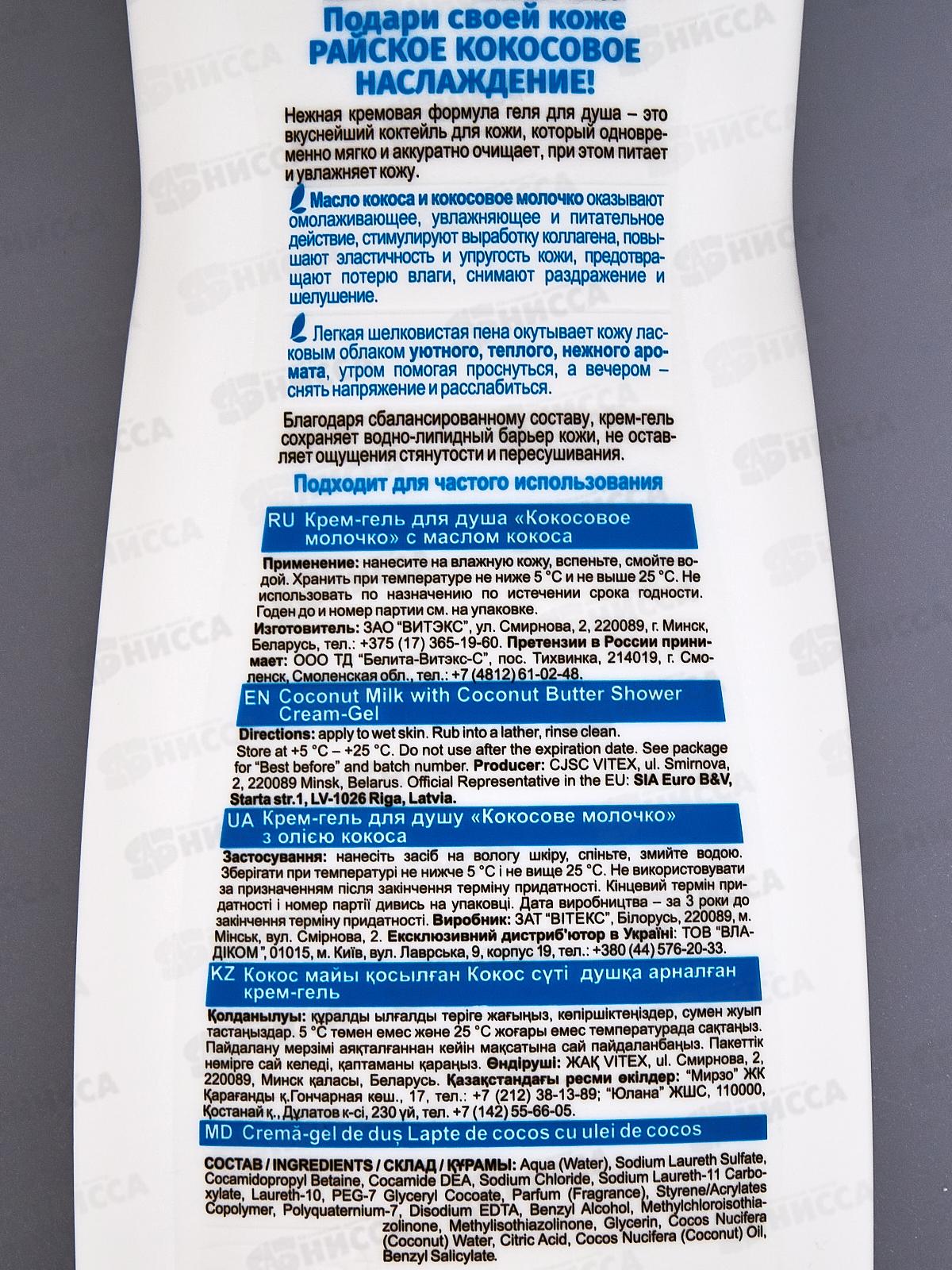 Нежная кремовая формула геля для душа – это вкуснейший коктейль для кожи, который одновременно мягко и аккуратно очищает, при этом питает и увлажняет кожу. Состав: вода, лауретсульфат натрия, кокамидопропилбетаин, кокамид ДЭА, хлорид натрия, лаурет-11 карбоксилат натрия, лаурет-10, ПЭГ-7 глицерилкокоат, парфюмерная композиция, сополимер стирола и акрилатов натрия, поликватерниум-7, ЭДТА динатрия, бензиловый спирт, метилхлоризотиазолинон, метилизотиазолинон, глицерин, кокосовая вода, лимонная кислота, масло Cocos Nucifera (кокосовое), бензилсалицилат.
