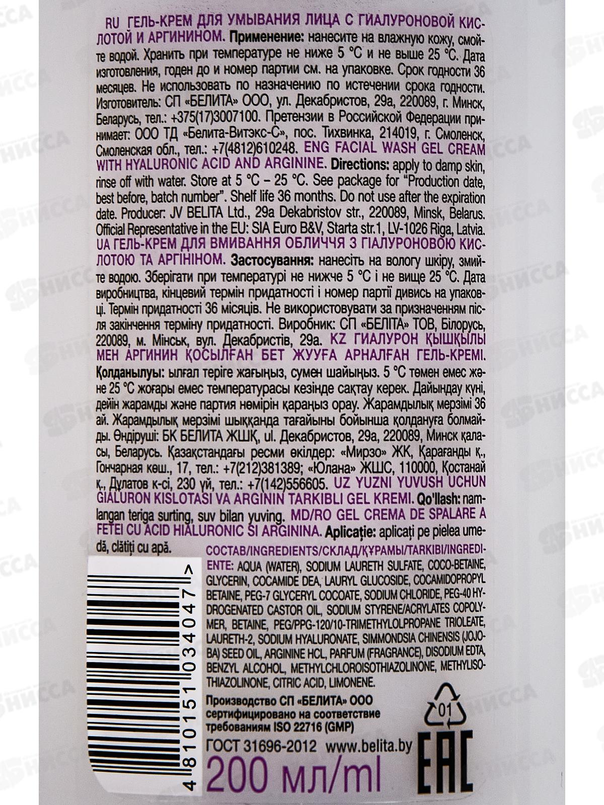 Гель-крем для умывания подходит для деликатного очищения кожи лица от загрязнений. После умывания кожа становится гладкой и шелковистой. Ухаживающие компоненты не оставляют ощущение стянутости и сухости на лице, интенсивно увлажняют и успокаивают кожу, стимулируют выработку коллагена. Состав: Аква (вода), Лауретсульфат натрия, Коко-бетаин, Глицерин, Кокамид ДЭА, Лаурилглюкозид, Кокамидопропилбетаин, Глицерилкокоат ПЭГ-7, Хлорид натрия, Сополимер стирола и акрилатов натрия, гидрогенизированное касторовое масло ПЭГ-40, Бетаин, ПЭГ/PPG-120/10-Триметилолпропантриолеат, Лаурет-2., Парфюмированная вода (отдушка), Аргинин HCl, Динатрий ЭДТА, Бензиловый спирт, метилхлоризотиазолинон, Метилизотиазолинон, Лимонная кислота, Масло семян симмондсии китайской (жожоба), гиалуронат натрия, Лимонен.