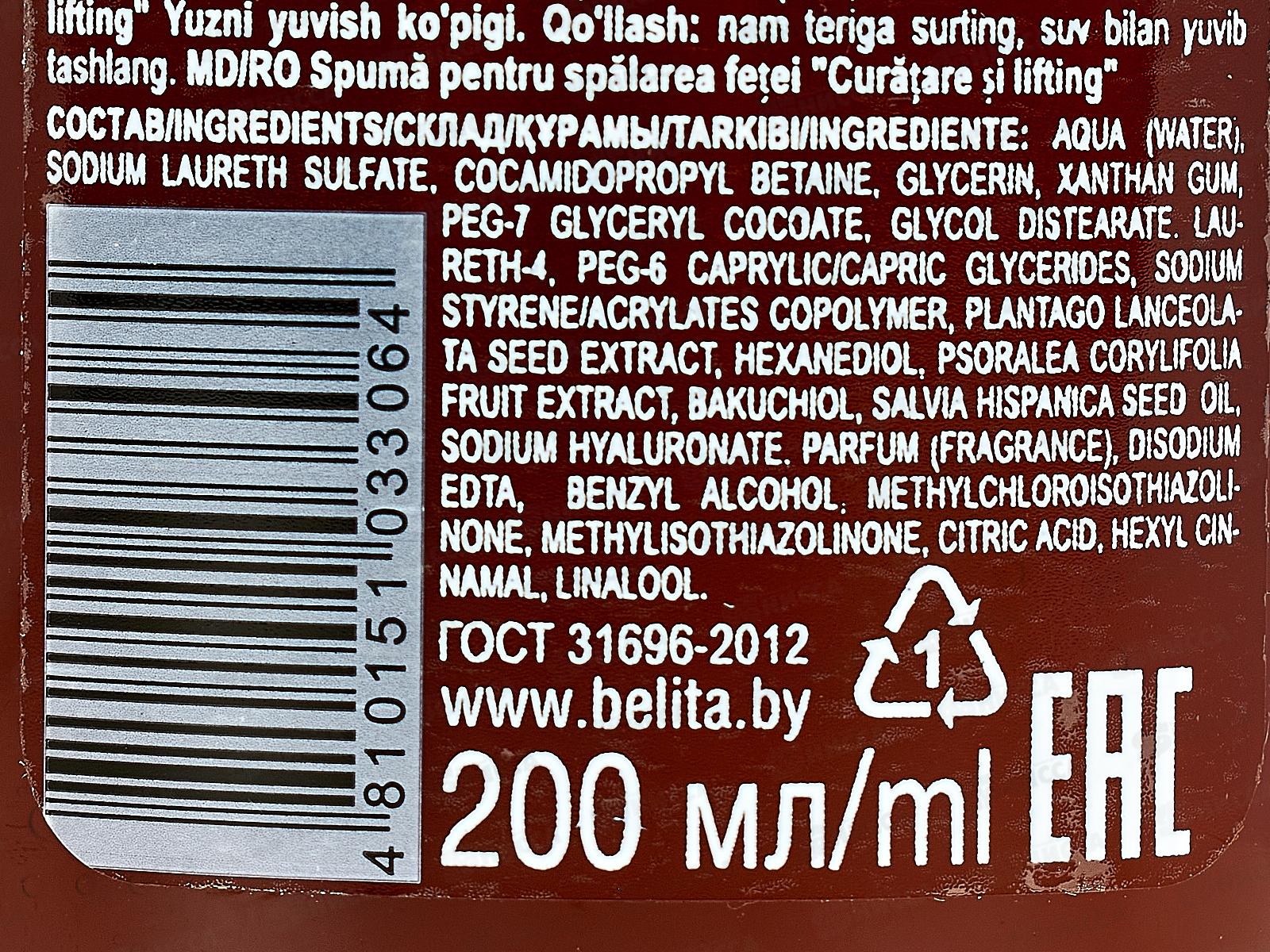 Нежная пенка для ежедневного умывания тщательно очищает кожу от загрязнений, не нарушая естественный защитный барьер. Комплекс активных компонентов (CS-Bakuchiol, 3Dermilyn, Масла чиа и ши, Низкомолекулярная гиалуроновая кислота, Протеины сладкого миндаля): мягко и эффективно очищает, предупреждает преждевременное старение. Состав: Вода, лауретсульфат натрия, кокамидопропилбетаин, глицерин, ксантановая камедь, ПЭГ-7 глицерилкокоат, ПЭГ-6 глицерилкаприлат/капрат, гликольдистеарат, лаурет-4, кокамидопропилбетаин, сополимер стирола и акрилатов натрия, парфюмерная композиция, Экстракт плодов псоралеи лещинолистной, бакучиол, вода, экстракт семян подорожника ланцетного, гександиол, бензиловый спирт, метилхлоризотиазолинон, метилизотиазолинон, ЭДТА динатрия, кислота лимонная, гиалуронат натрия, масло семян Salvia Hispanica (чиа), гексилциннамаль, линалол.