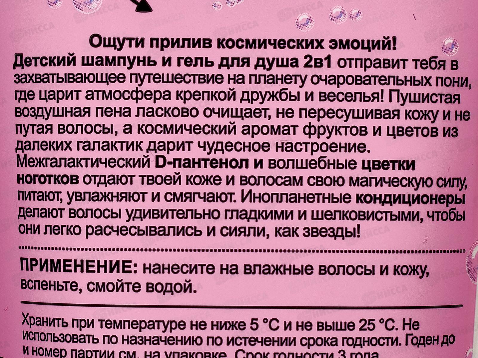 Детский шампунь и гель для душа 2в1 отправит тебя в захватывающее путешествие на планету очаровательных пони, где царит атмосфера крепкой дружбы и веселья! Пушистая воздушная пена ласково очищает, не пересушивая кожу и не путая волосы, а космический аромат фруктов и цветов из далеких галактик дарит чудесное настроение. Состав: Вода, лауретсульфат натрия, кокамидопропилбетаин, лауретсульфосукцинат натрия, хлорид натрия, децилглюкозид, ПЭГ-7 глицерилкокоат, ПЭГ-150 полиглицерил-2 тристеарат, лаурет-3, дипропиленгликоль, ППГ-3 каприлиловый эфир, парфюмерная композиция, пантенол, экстракт Calendula Officinalis (календулы), бензиловый спирт, метилхлоризотиазолинон, метилизотиазолинон, гидроксид натрия, хлорид гидроксипропилтримония гуара, лимонен, гексилциннамаль.