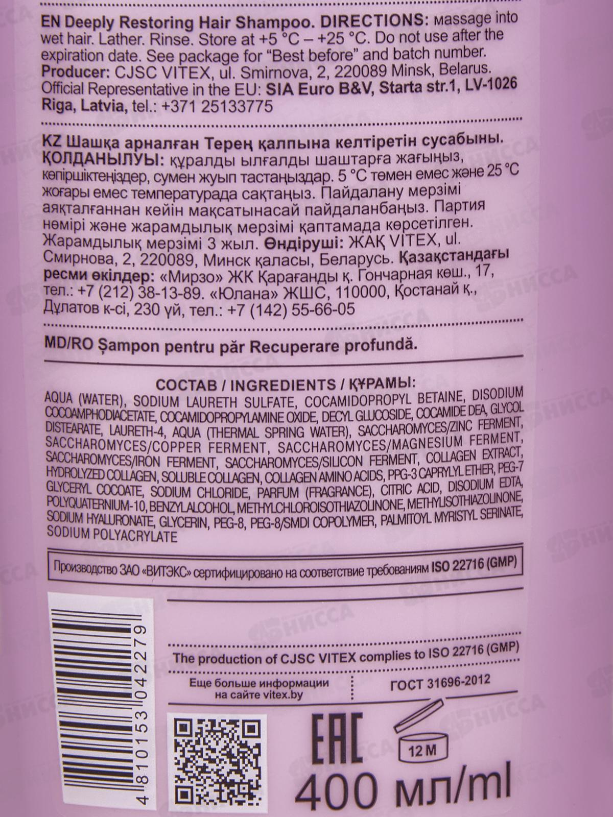 Насыщенный шампунь с богатым составом компонентов позволяет преобразить даже очень поврежденные, тонкие и сухие волосы. Максимально мягкая формула эффективно и очень нежно очищает волосы и кожу головы, не вызывает пересушивания и раздражения. Состав: вода, лауретсульфат натрия, кокамидопропилбетаин, кокоамфодиацетат динатрия, кокамидопропиламиноксид, децилглюкозид, кокамид ДЭА, гликольдистеарат, лаурет-4, термальная вода, ППГ-3 каприлиловый эфир, ПЭГ-7 глицерилкокоат, лимонная кислота, парфюмерная композиция, поликватерниум-10, фермент сахаромицет / цинк, фермент сахаромицет / медь, фермент сахаромицет / магний, фермент сахаромицет / железо, фермент сахаромицет / кремний, гиалуронат натрия, экстракт коллагена, гидролизованный коллаген, растворимый коллаген, аминокислоты коллагена, хлорид натрия, ЭДТА динатрия, бензиловый спирт, метилхлоризотиазолинон, метилизотиазолинон, глицерин, ПЭГ-8, сополимер ПЭГ-8 / СМДИ, пальмитоилмиристилсиринат, полиакрилат натрия.