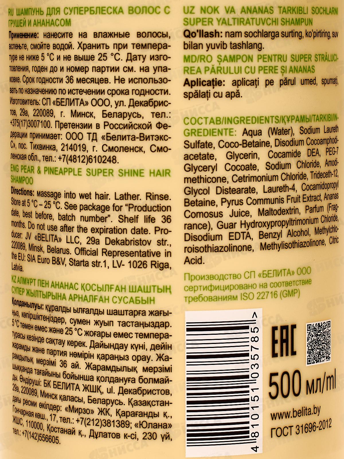 Созданная с особой тщательностью формула ухода за волосами наполнена питательными микроэлементами, придающими здоровый блеск и гладкость. Уникальная смесь экстракта груши и сока ананаса мягко очищает волосы, удаляя загрязнения и придавая им ощущение свежести и легкости. Состав: Аква (вода), Лаурет сульфат натрия, Коко-Бетаин, Динатриевый кокоамфодиацетат, Глицерин, Кокамид ДЭА, ПЭГ-7 Глицерилкоакоат, хлорид натрия, Амодиметикон, Цетримоний хлорид, Тридецет-12, Дистеарат гликоля, Лаурет-4, Кокамидопропил бетаин, Экстракт плодов Pyrus Communis, сок Ананаса Большого, мальтодекстрин, Парфюмированная вода (отдушка), гидроксипропилтримонийхлорид гуара, Динатрий ЭДТА, Бензиловый спирт, Метилхлоризотиазолинон, Метилизотиазолинон, Лимонная кислота.